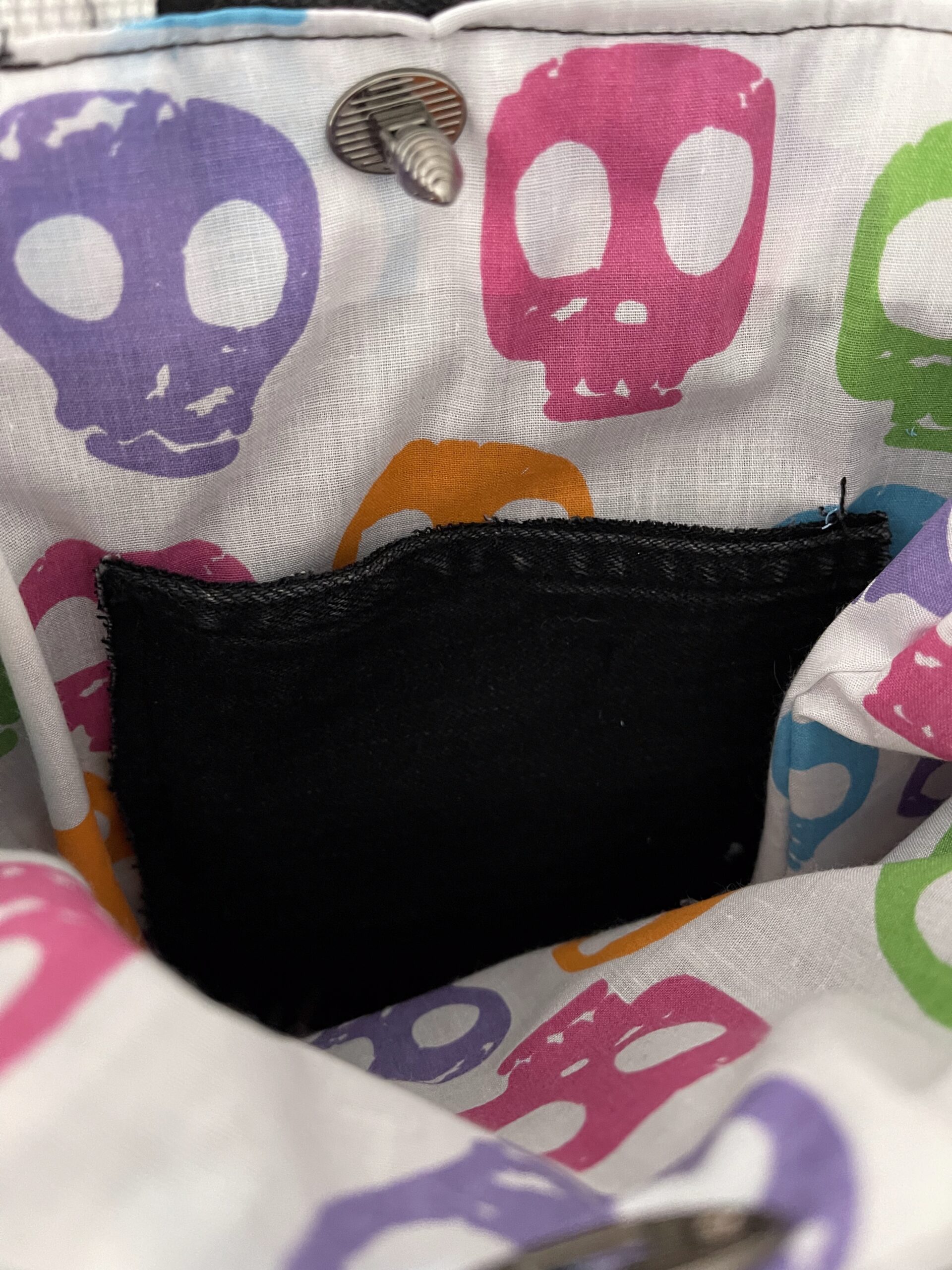 Featuring a twin handle design, blue stud embellishments, and a striking bee clasp, this eco-friendly accessory is finished with a bold skull pattern lining.