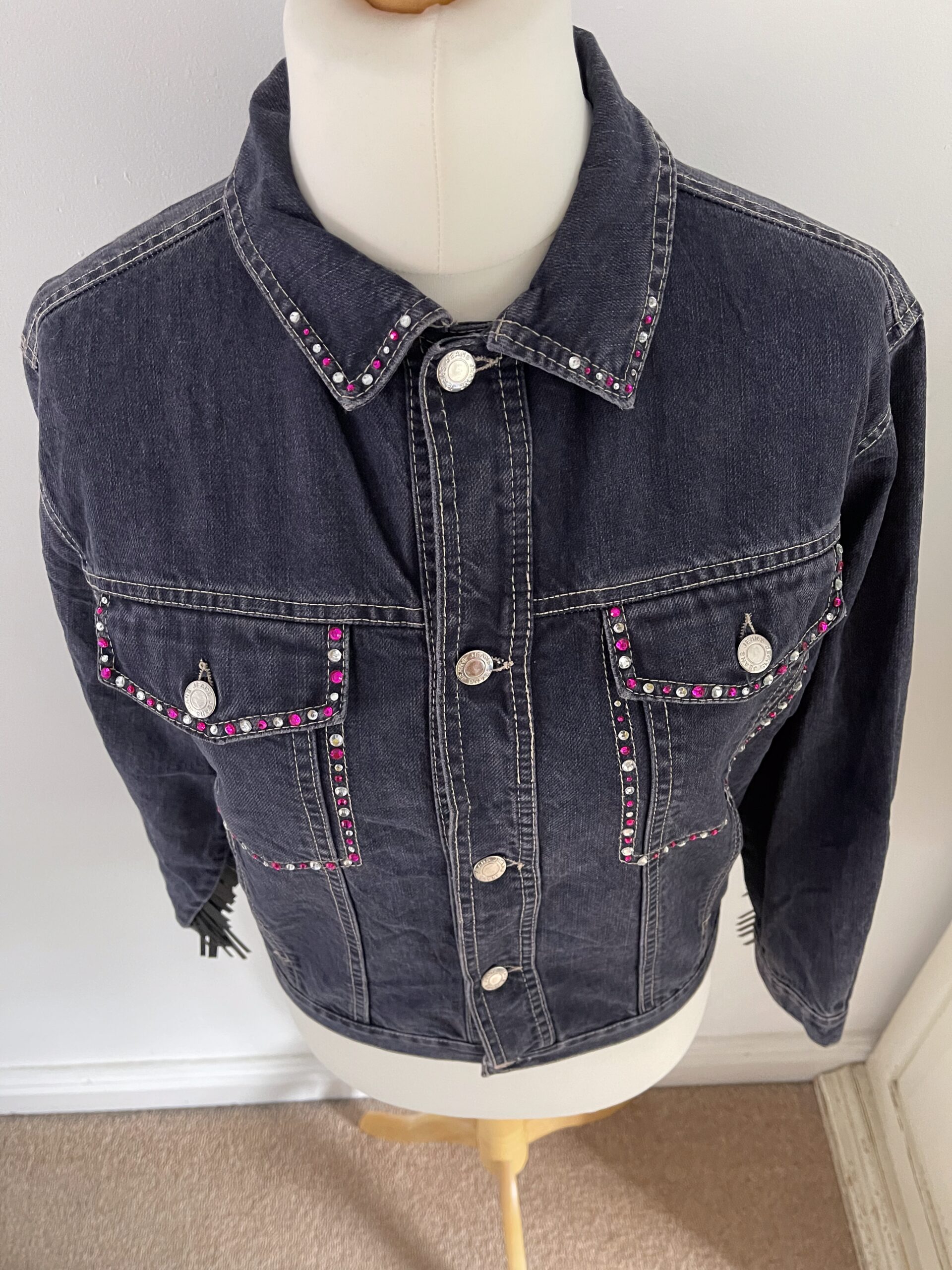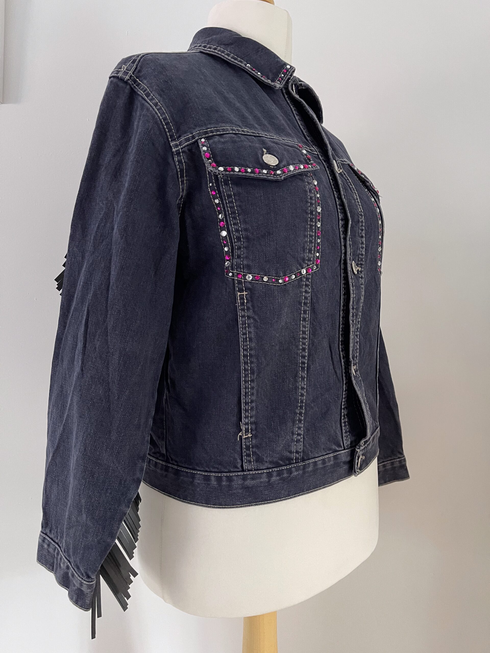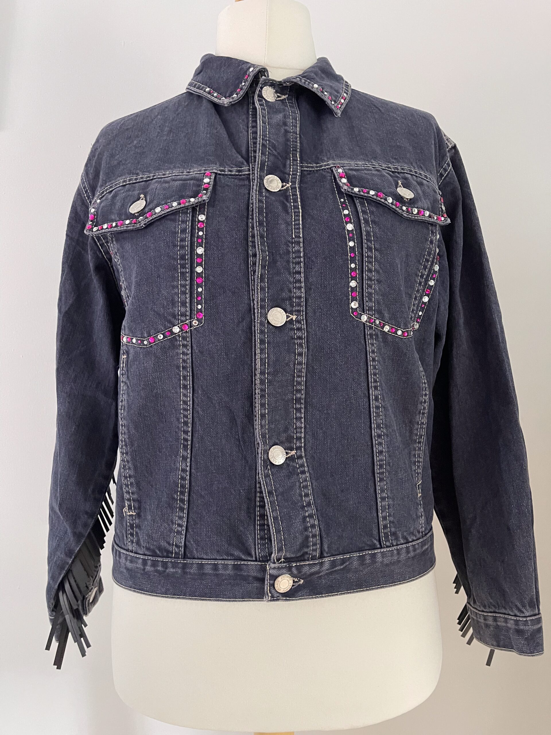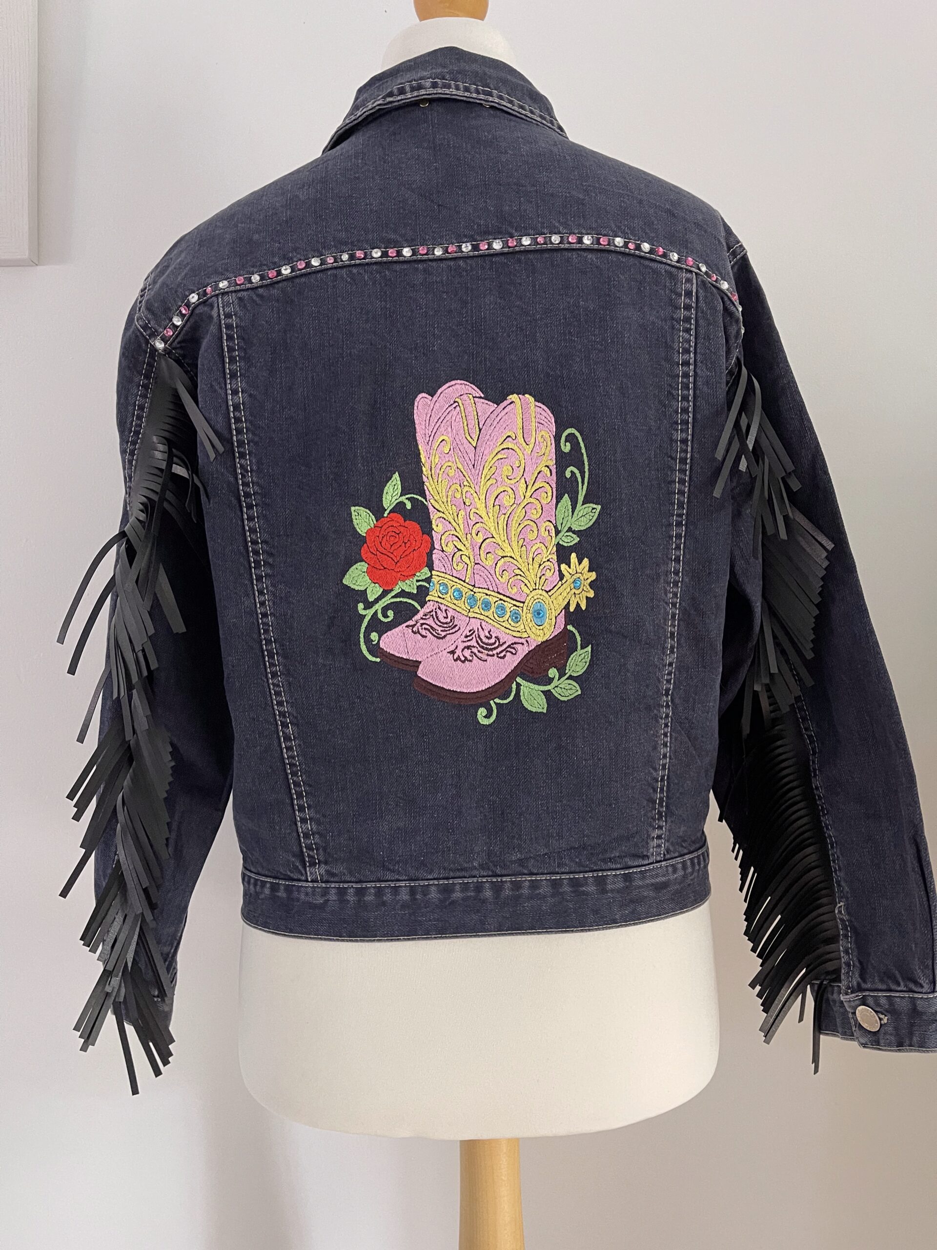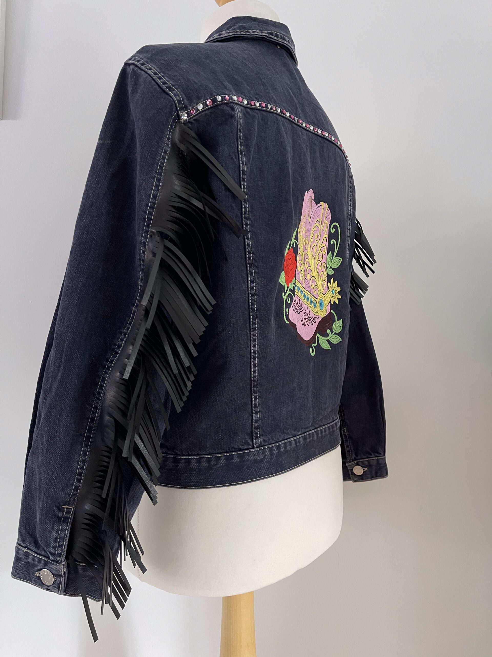 Ladies vintage upcycled denim jacket custom embroidered and embellished with sparkling diamantes for a unique, sustainable fashion statement.