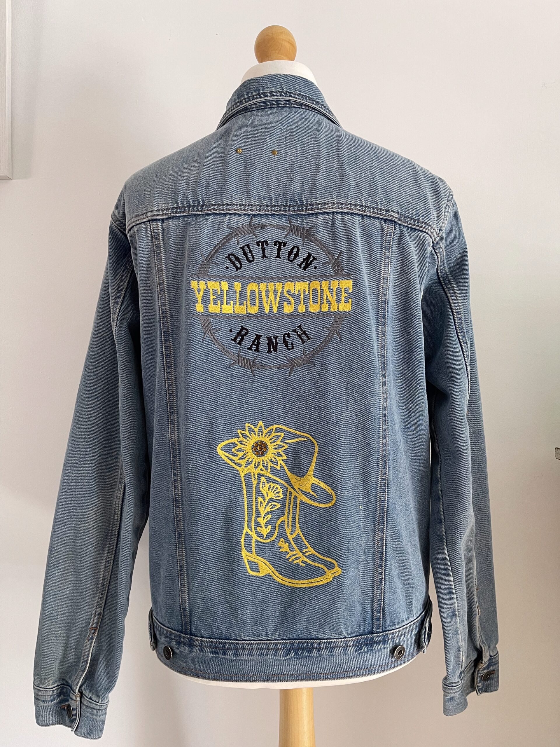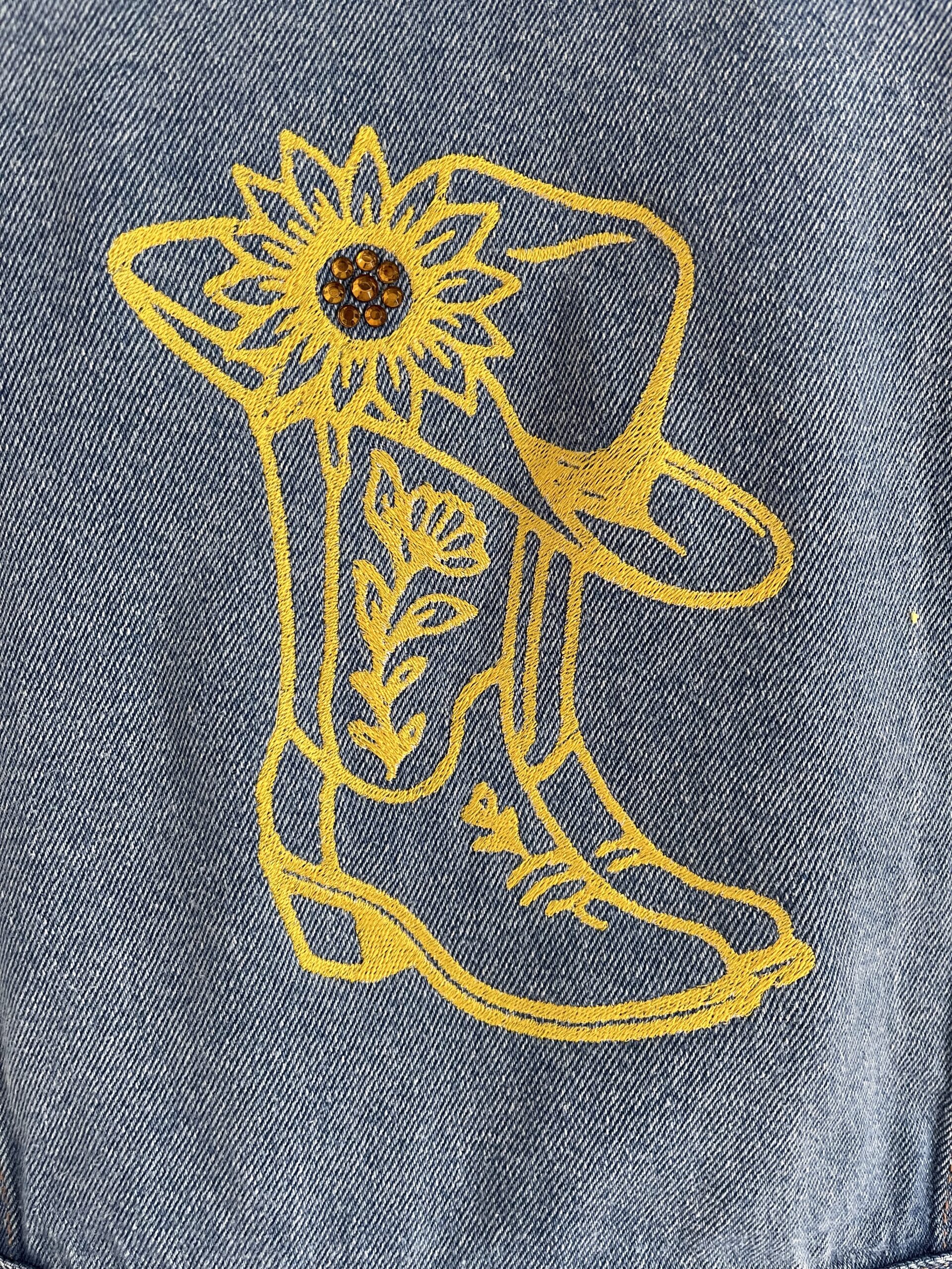 Vintage upcycled denim jacket custom embroidered for a unique unisex style.