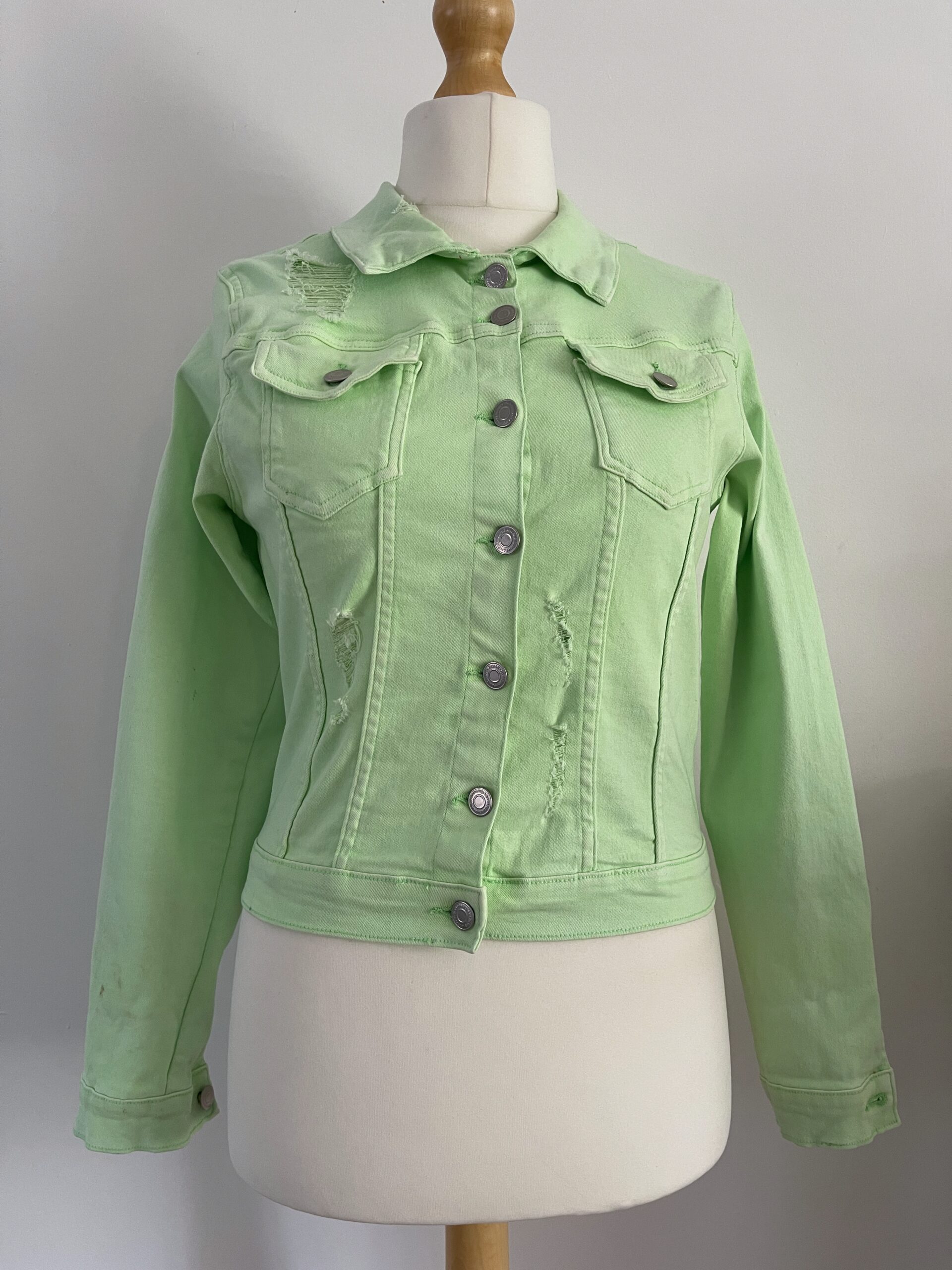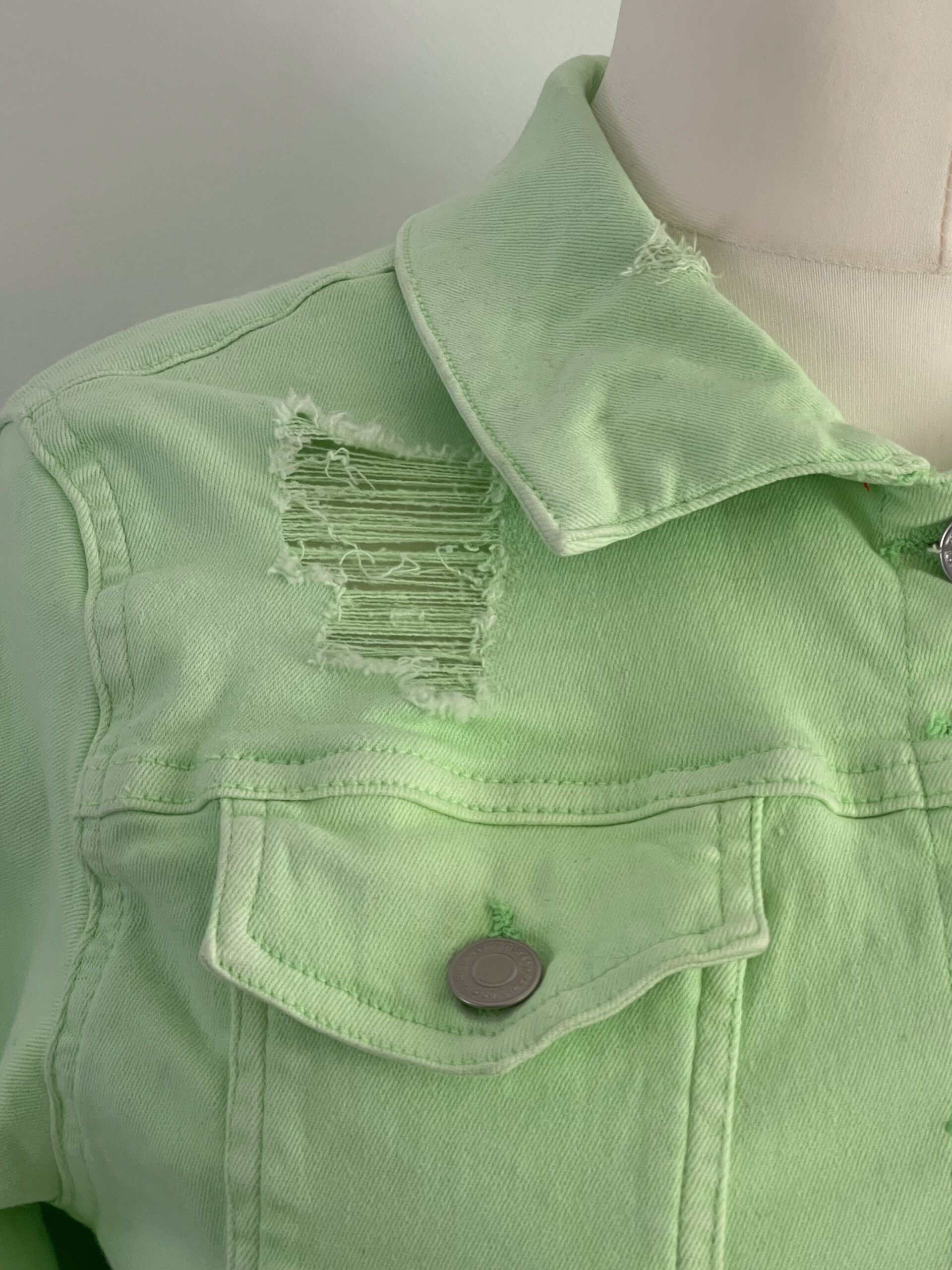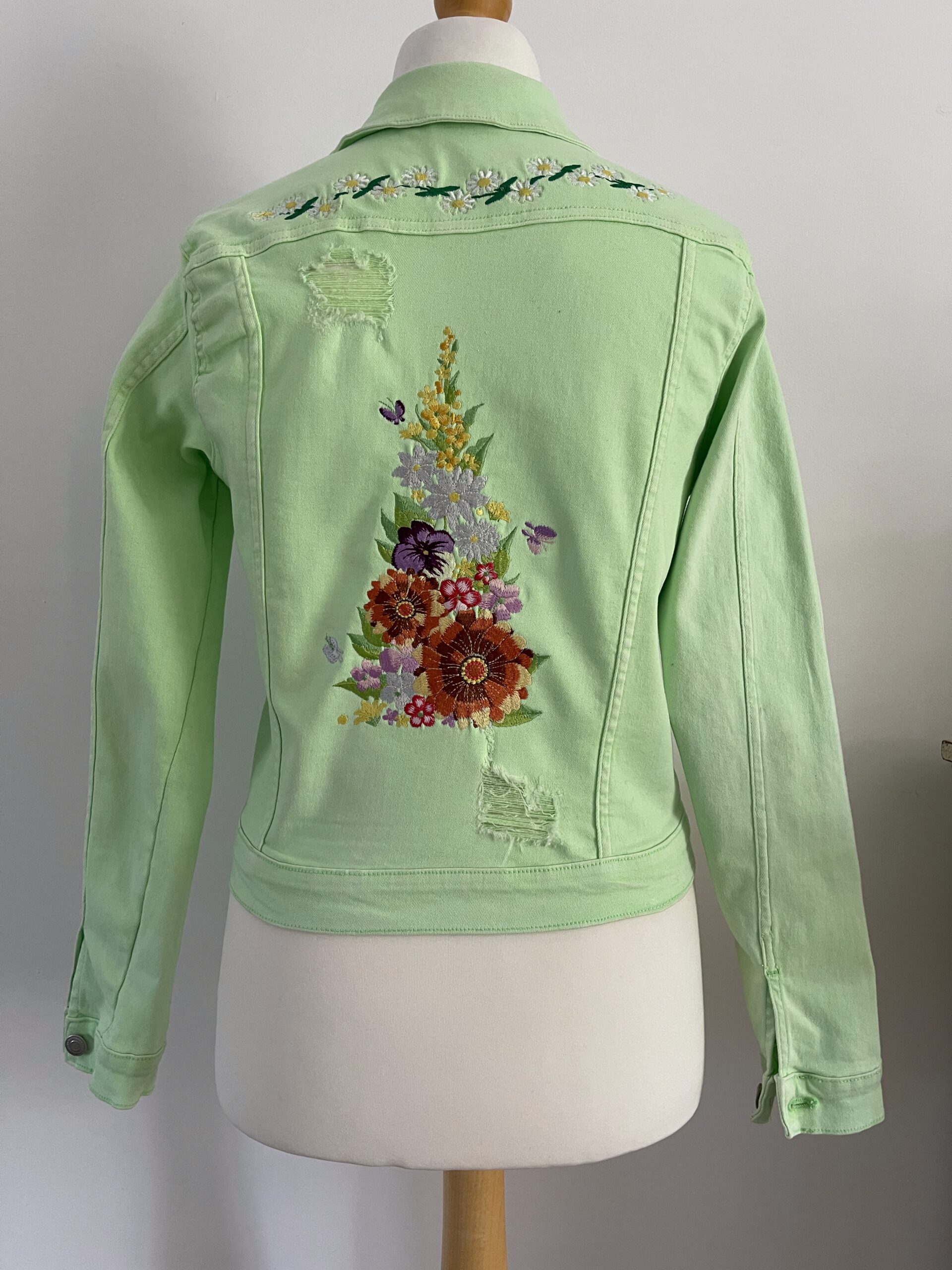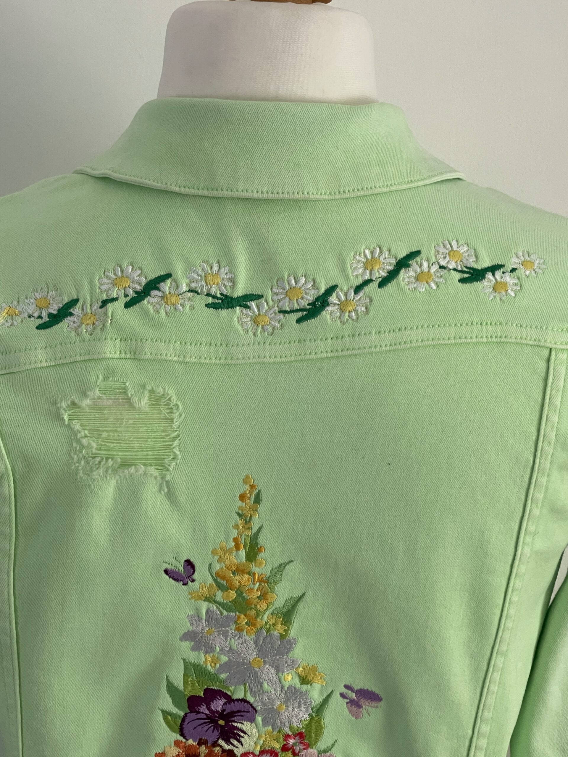 Vintage upcycled green jacket with a distressed look, featuring custom‑embroidered flowers.