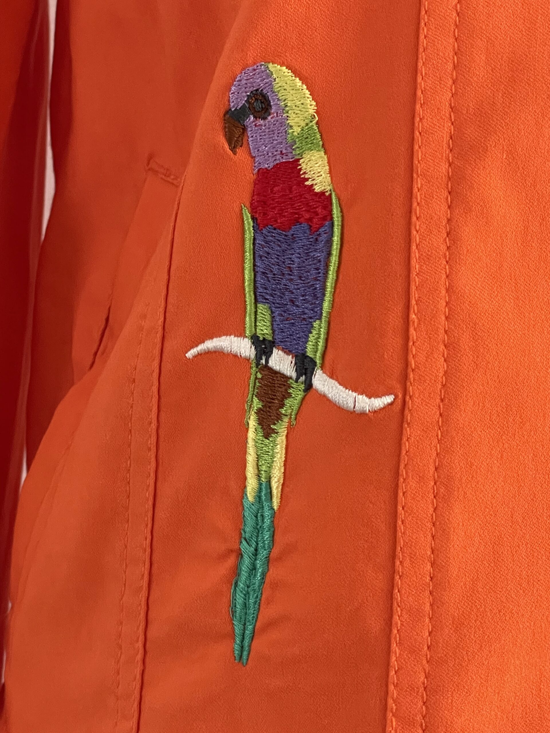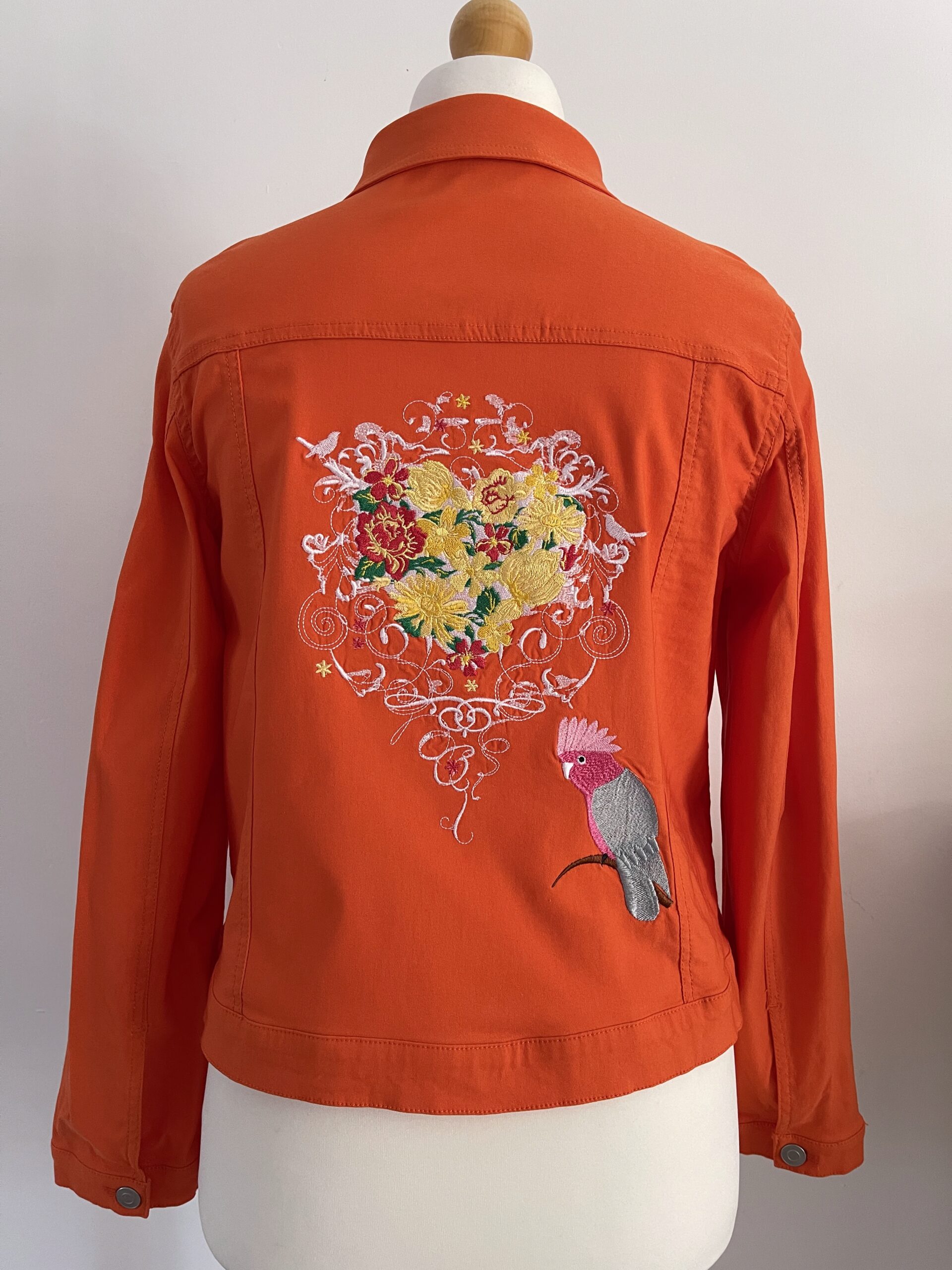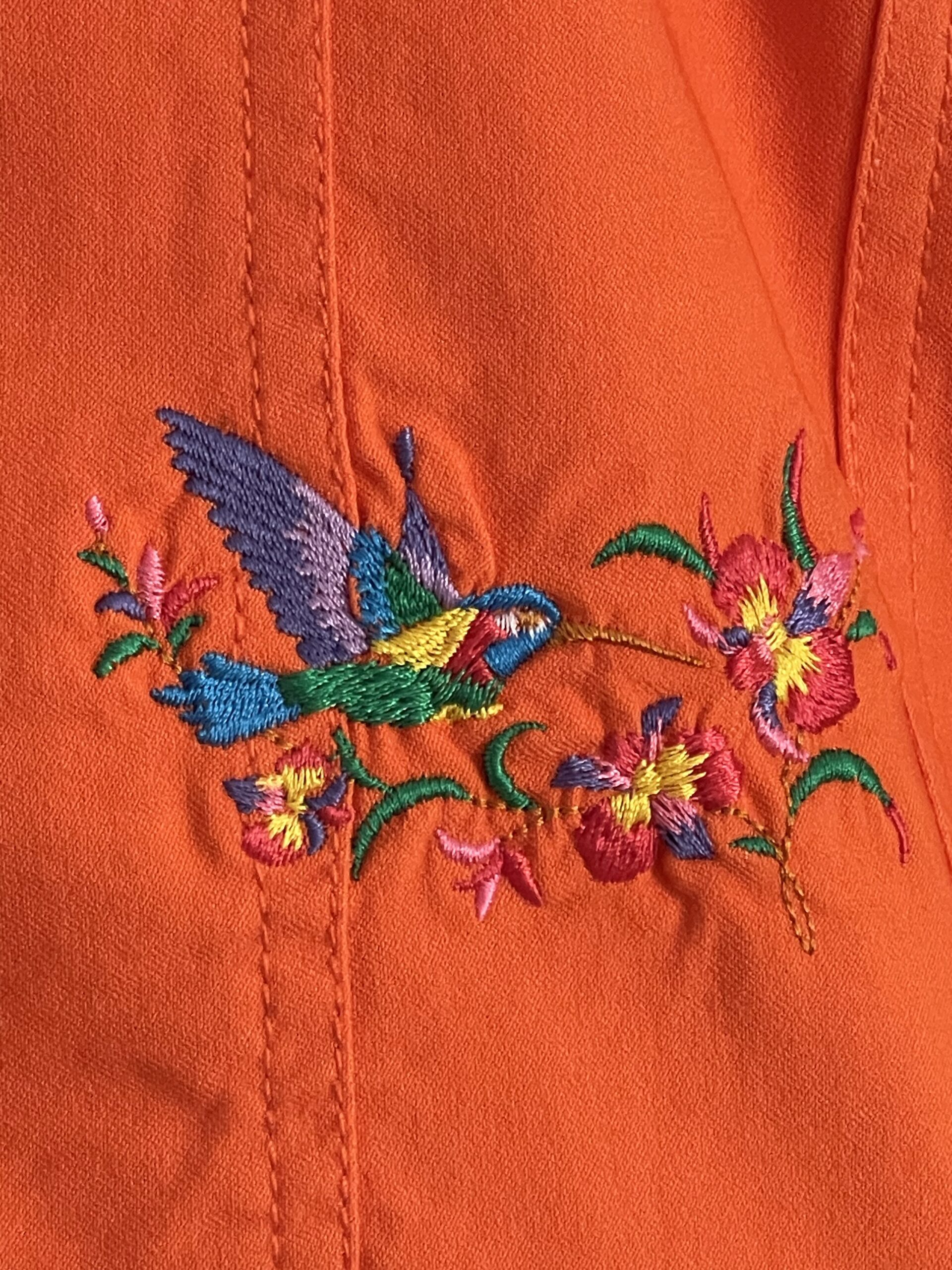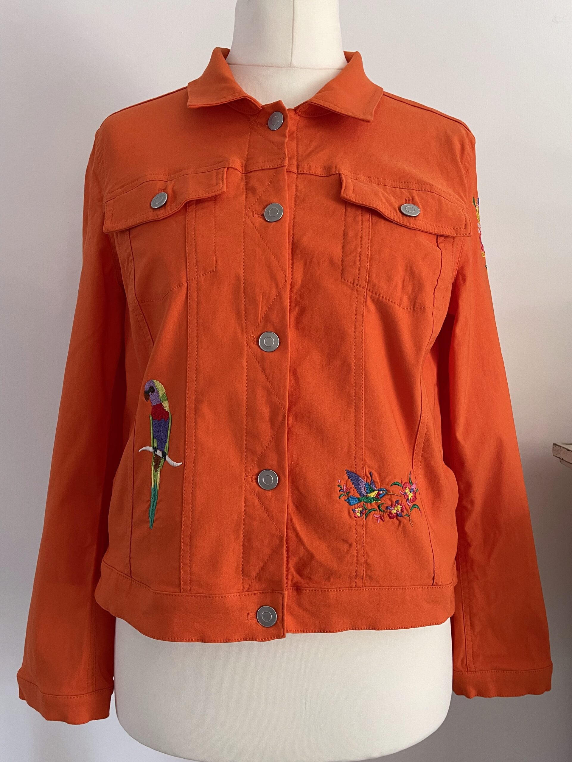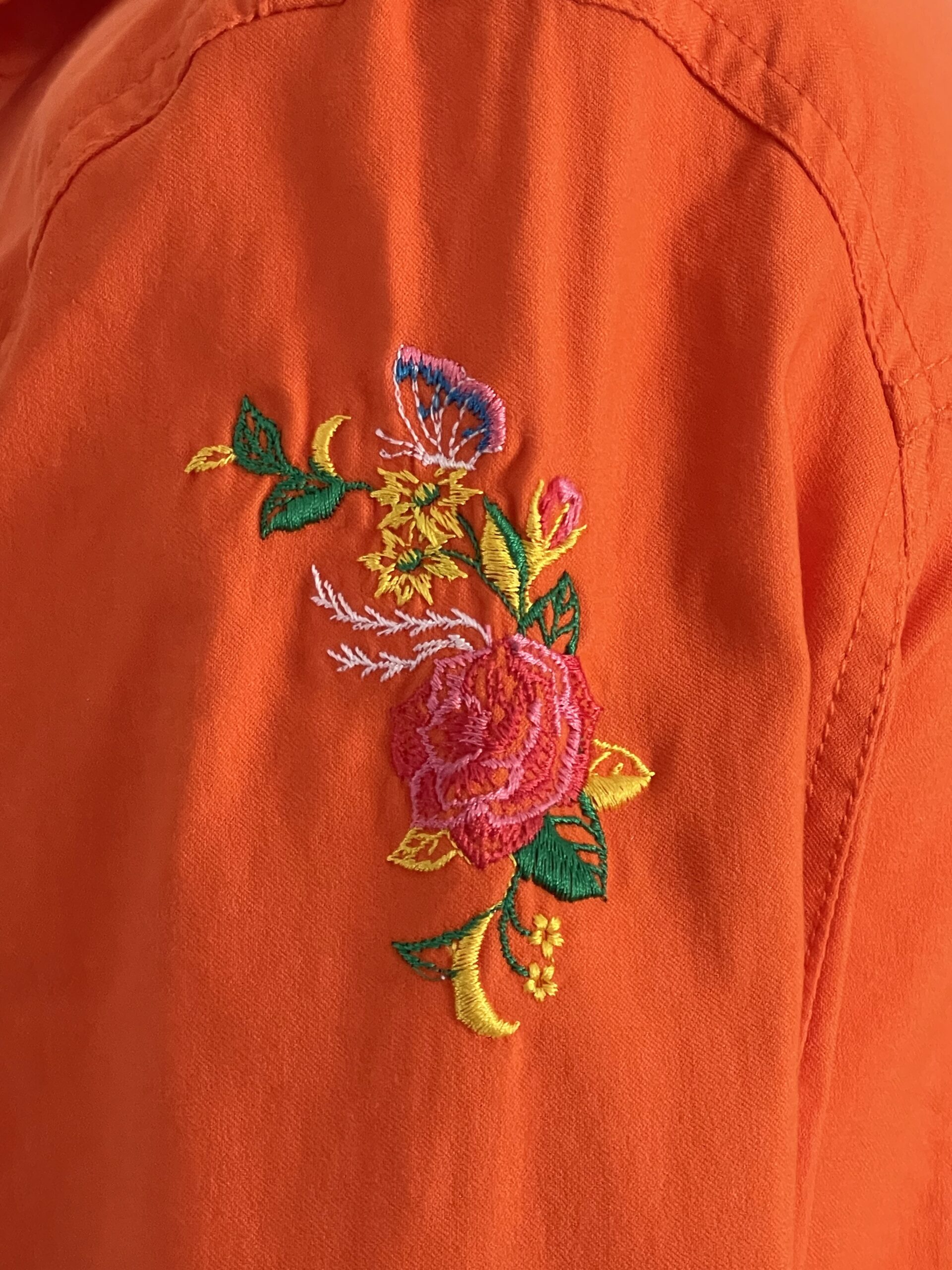 Vintage upcycled orange jacket featuring custom‑embroidered flowers and birds.