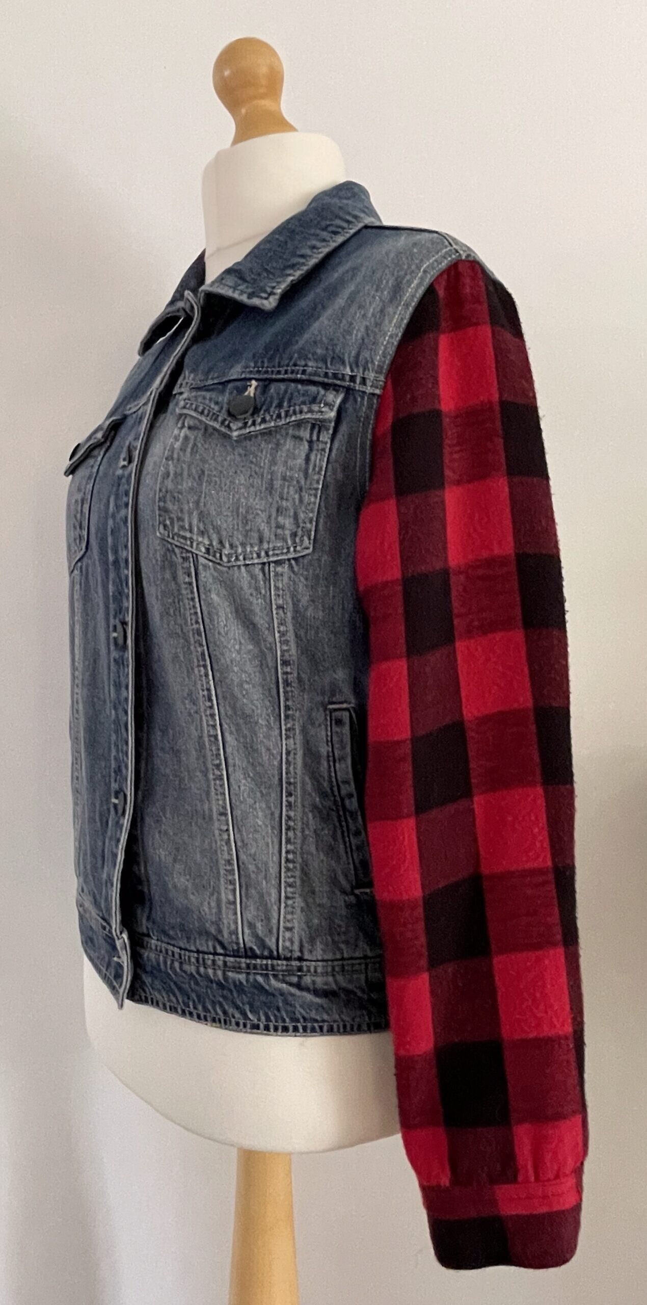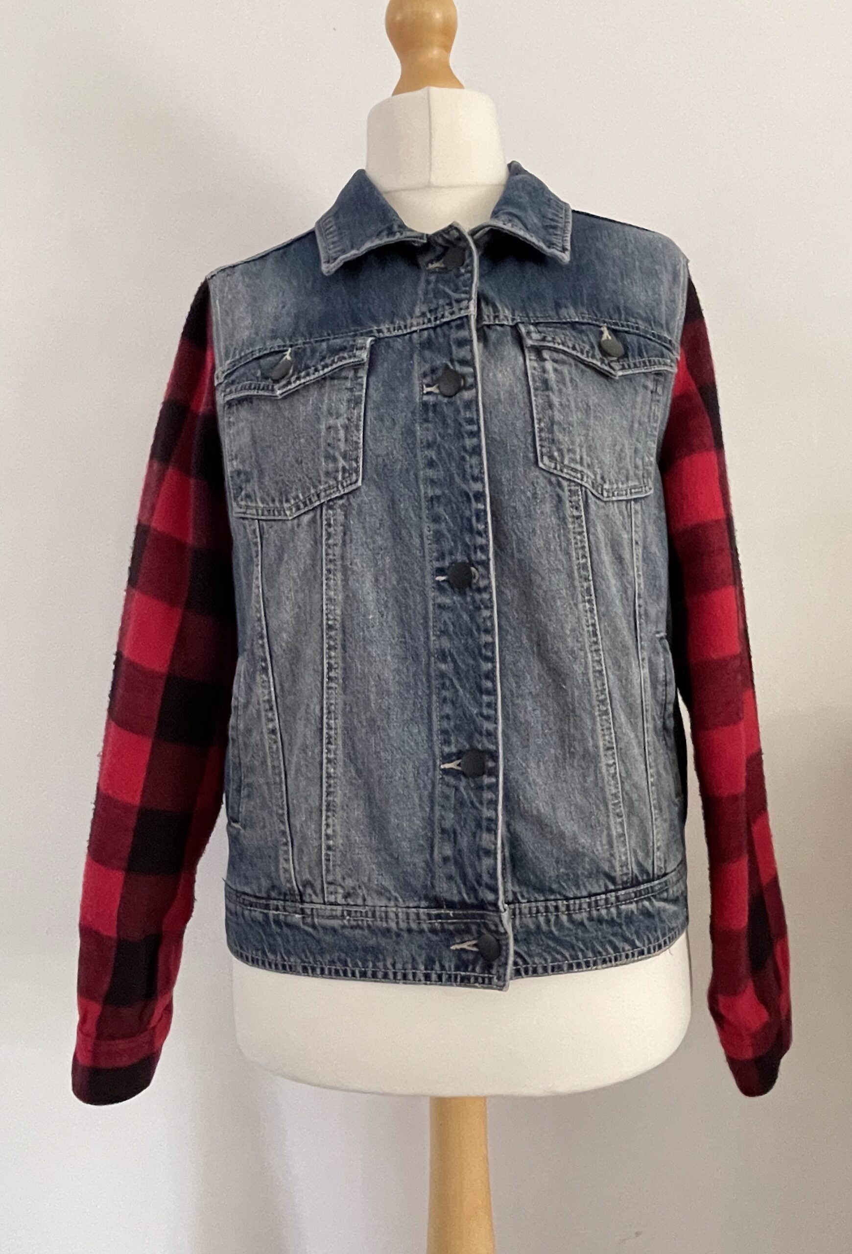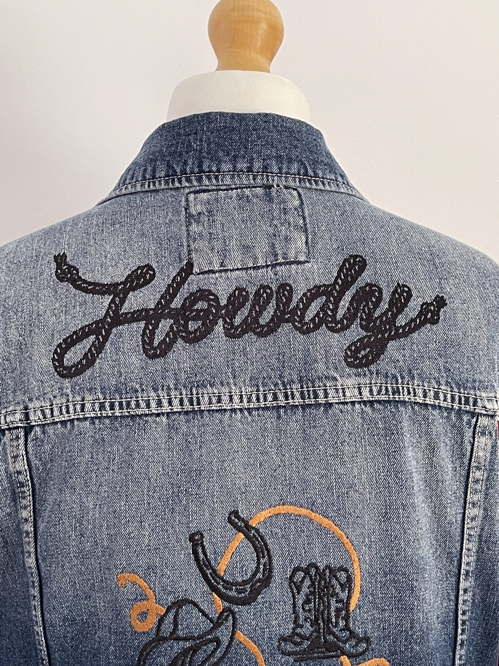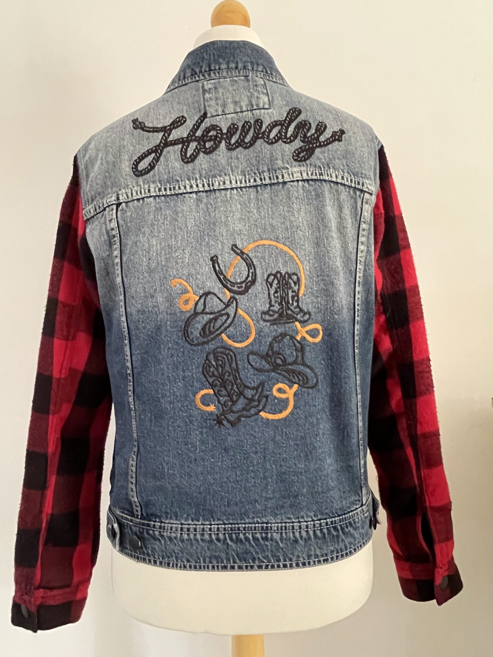 Vintage upcycled denim jacket with lumberjack sleeves, custom embroidered in a Western theme.