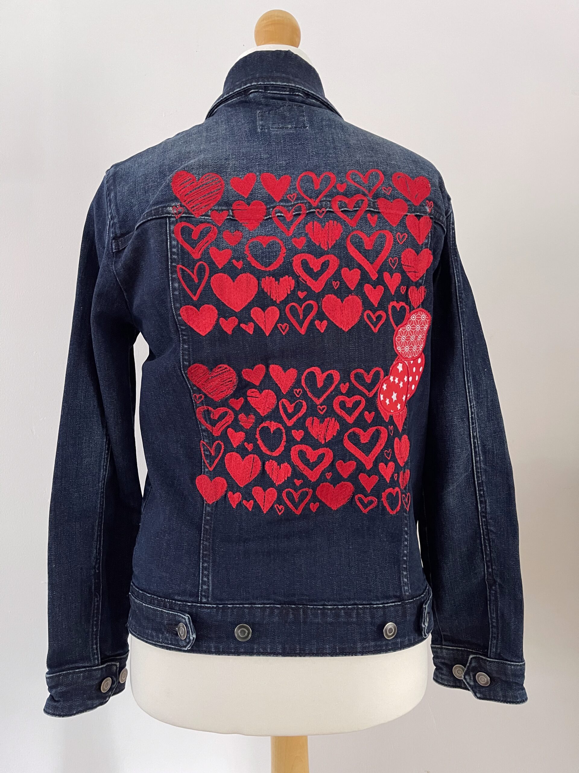A vintage‑style upcycled denim jacket custom embroidered with bold red hearts.