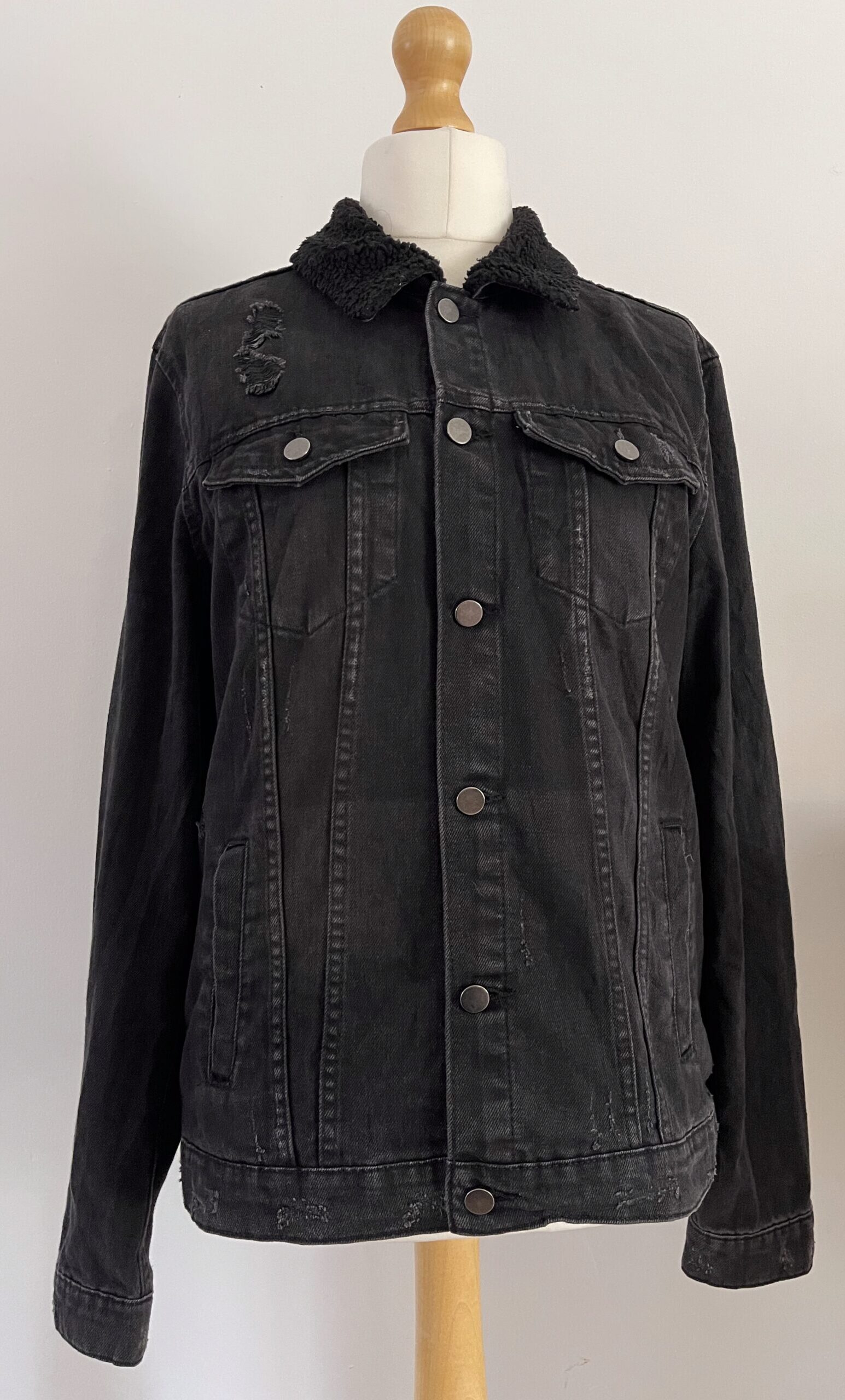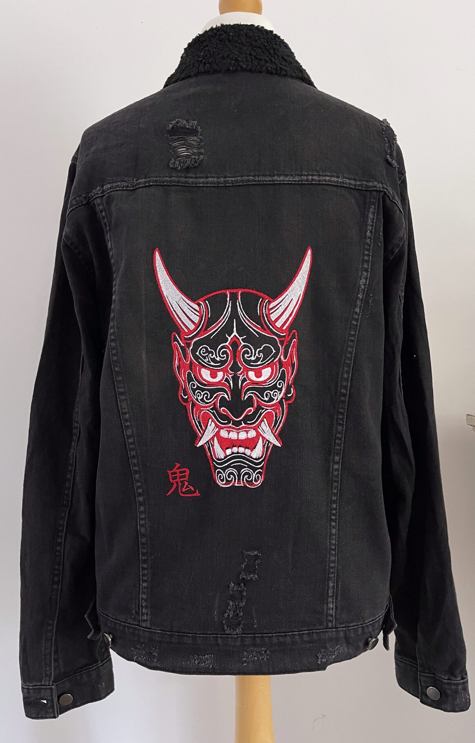 Vintage upcycled distressed denim jacket with a black fleece collar, featuring a custom‑embroidered traditional Oni Mask design. Unisex size M cotton‑blend, with measurements 56cm armpit to armpit, 68cm shoulder to hem, and 51cm armpit to cuff.