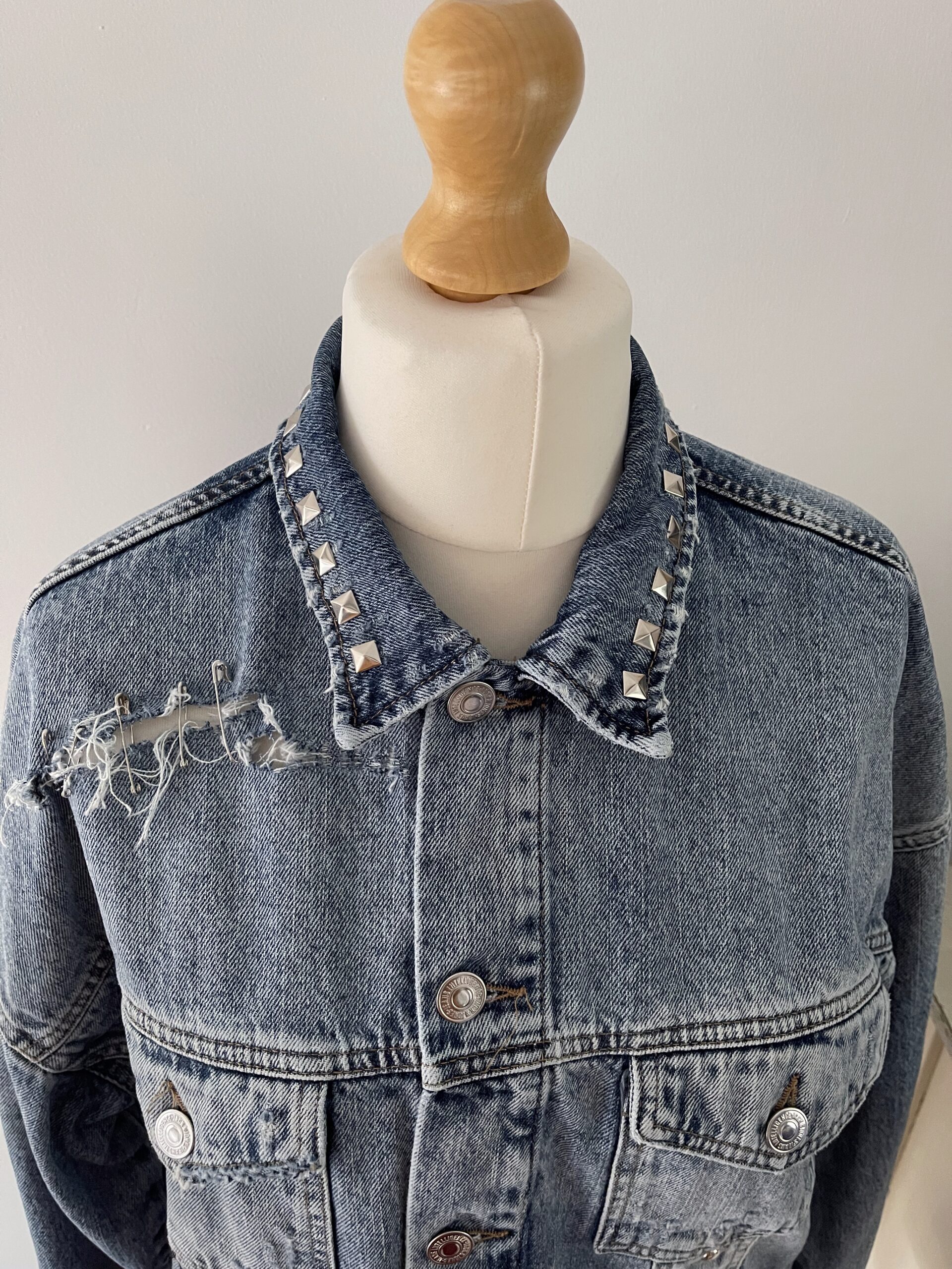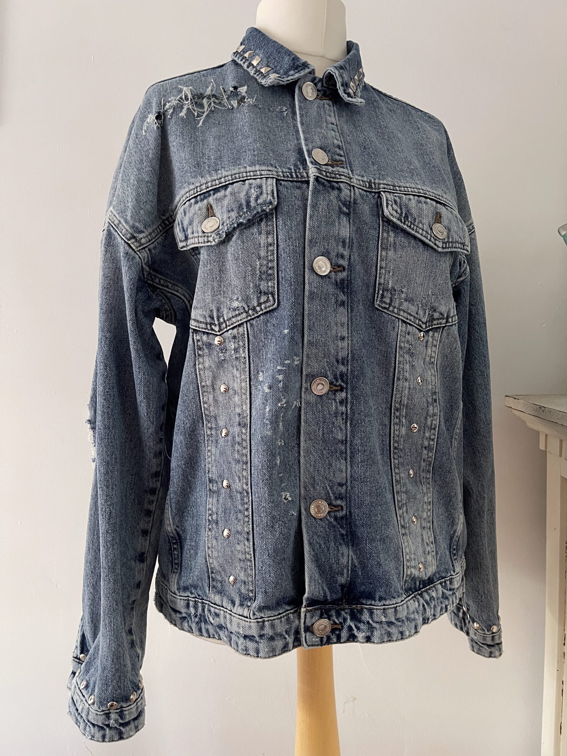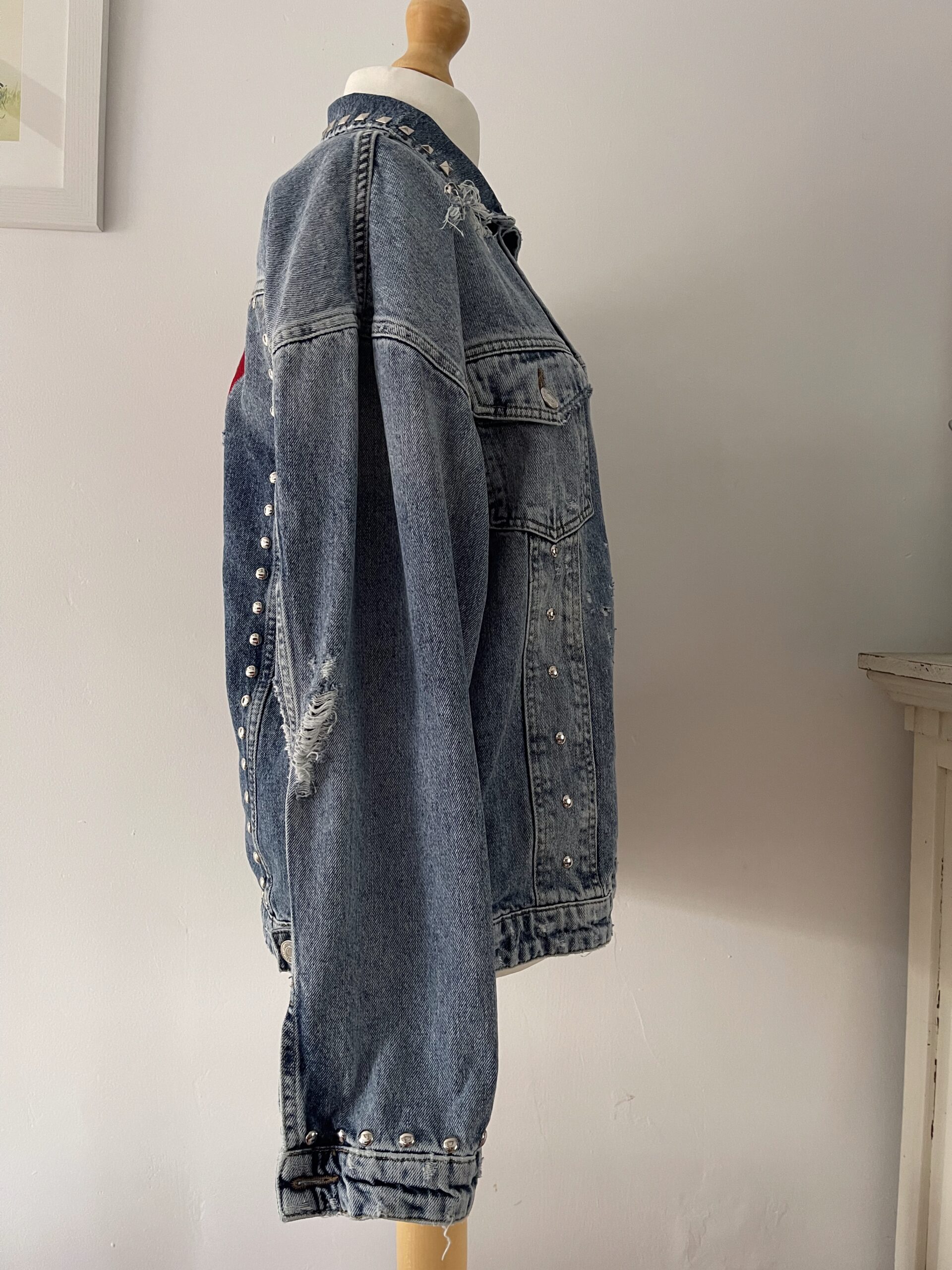 A standout reworked denim jacket perfect for lovers of punk fashion, upcycled clothing, and unique handmade statement pieces.