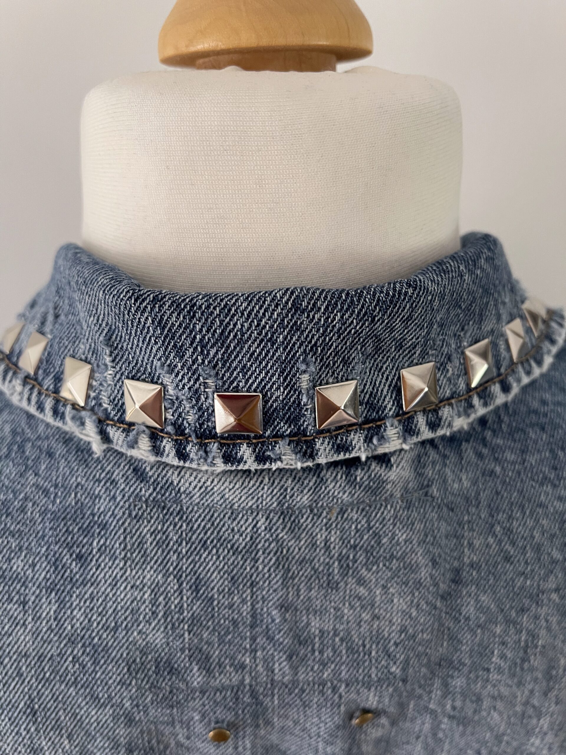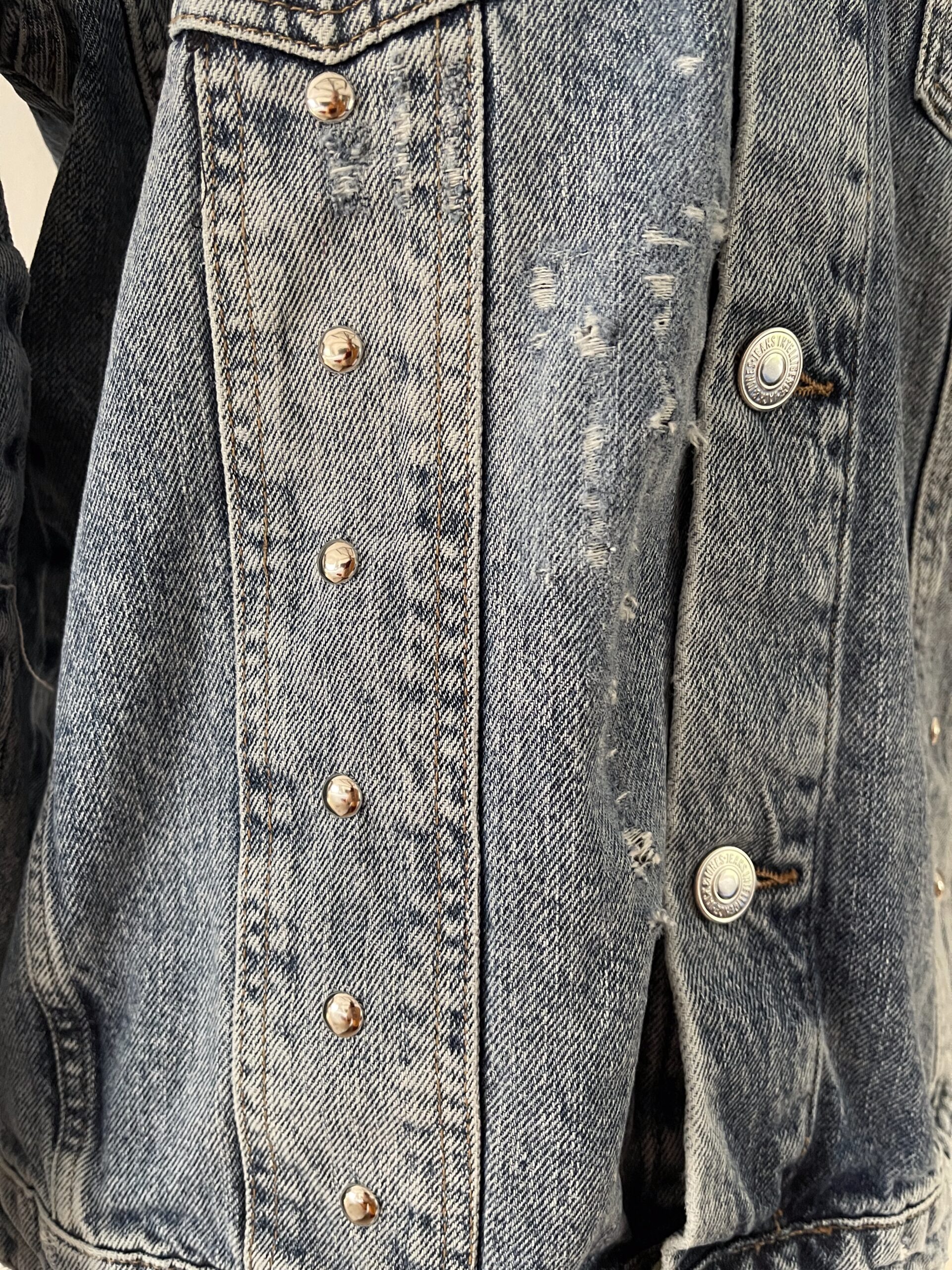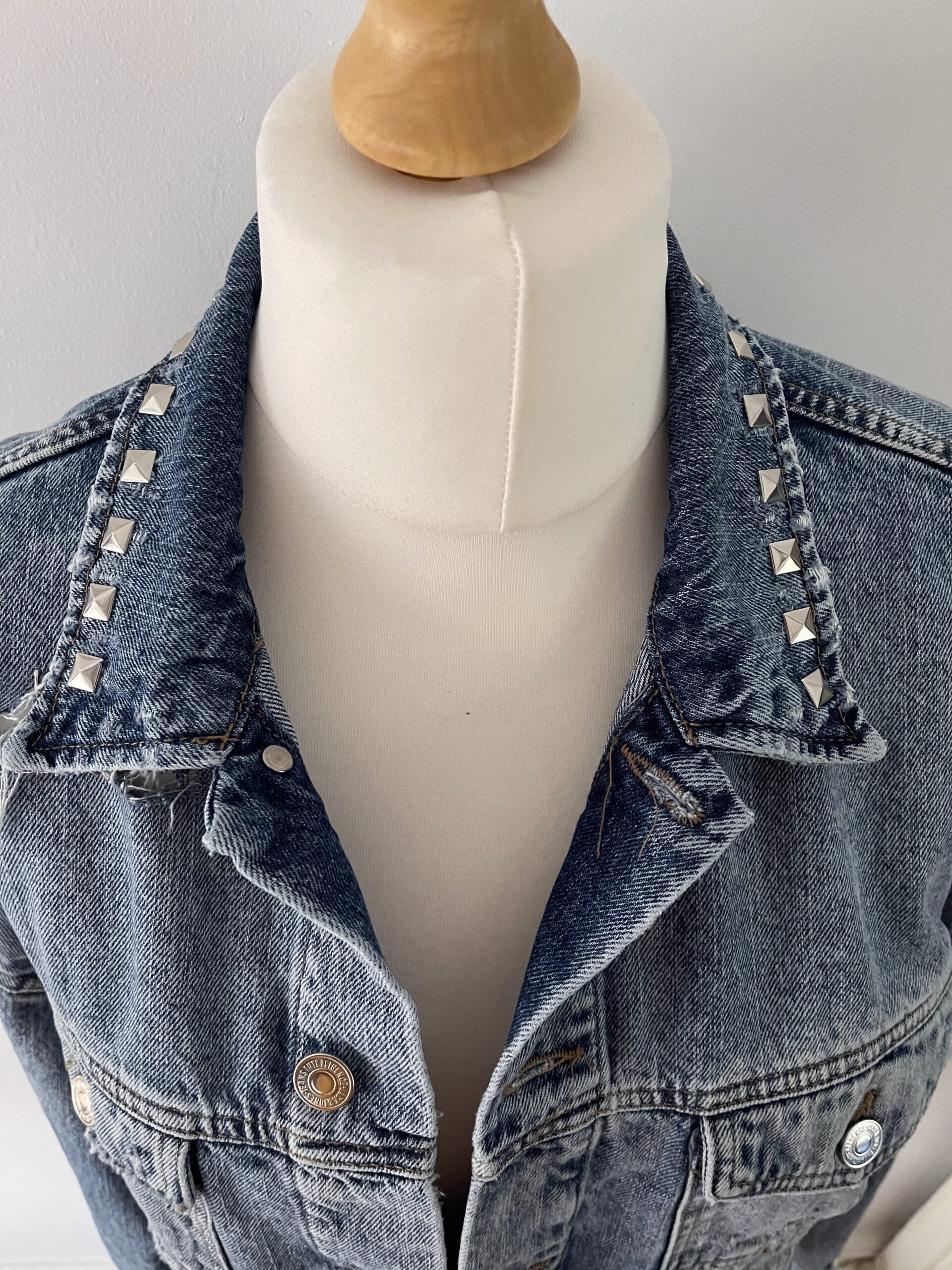 A standout reworked denim jacket perfect for lovers of punk fashion, upcycled clothing, and unique handmade statement pieces.