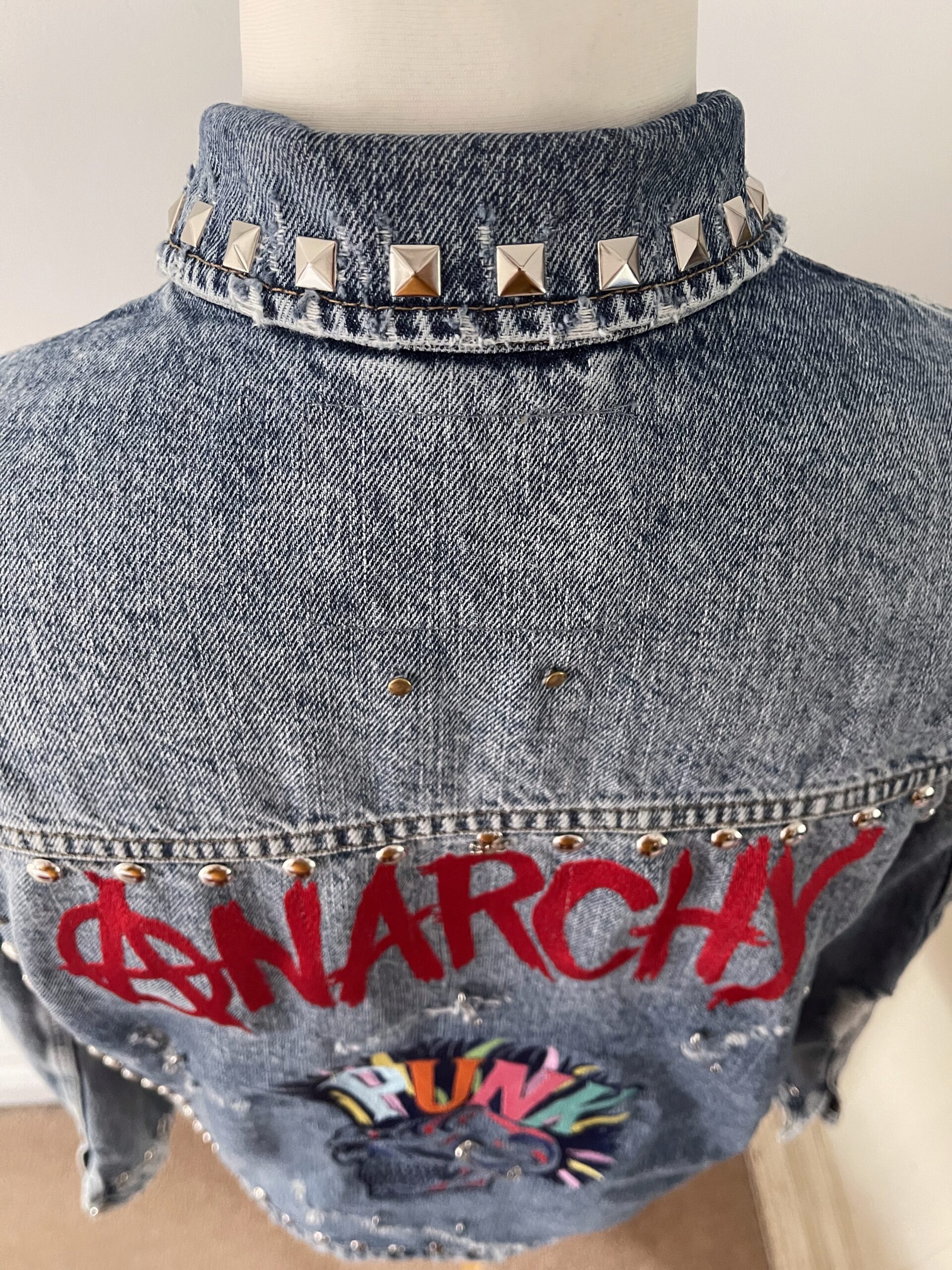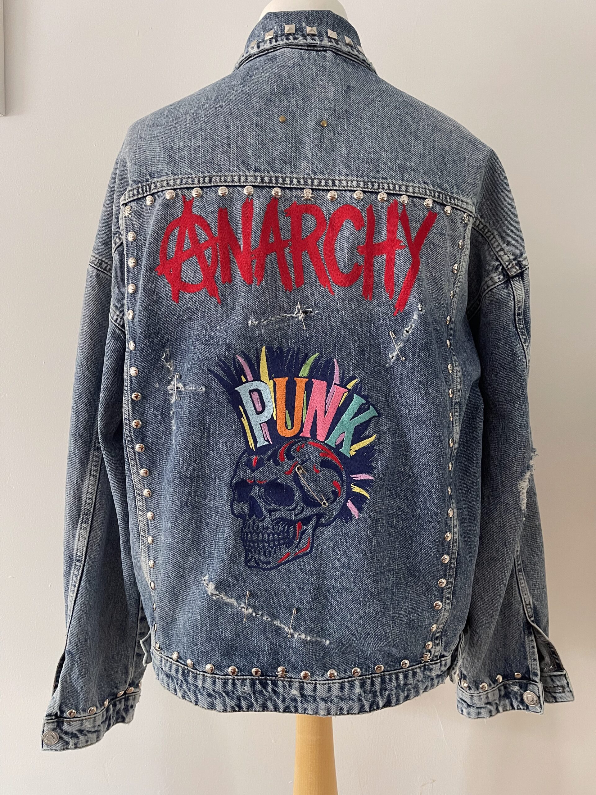Vintage upcycled and distressed Jack & Jones denim jacket custom embroidered with a bold punk skull anarchy design, finished with metal studs and safety‑pin embellishments for an authentic punk aesthetic.
