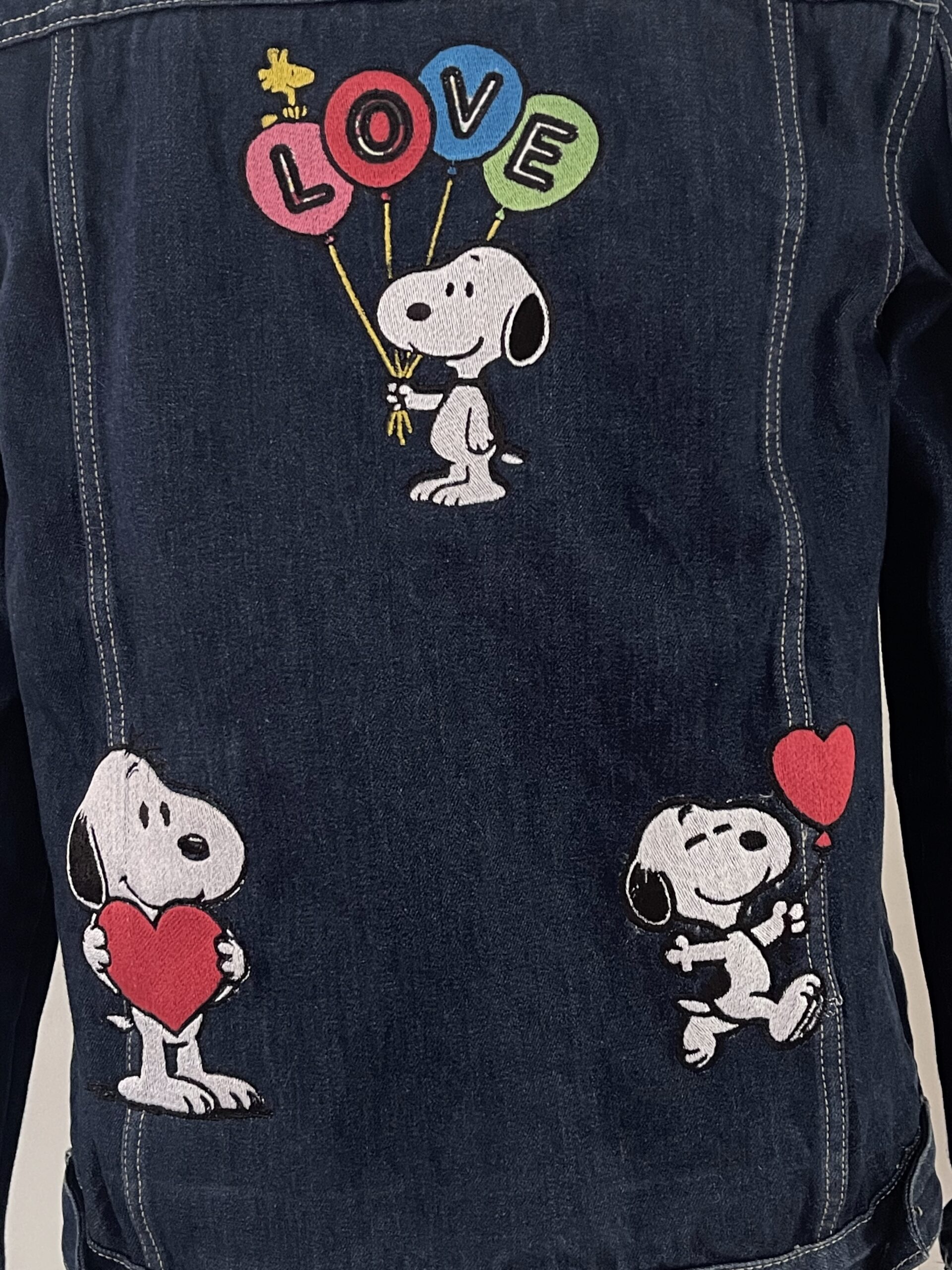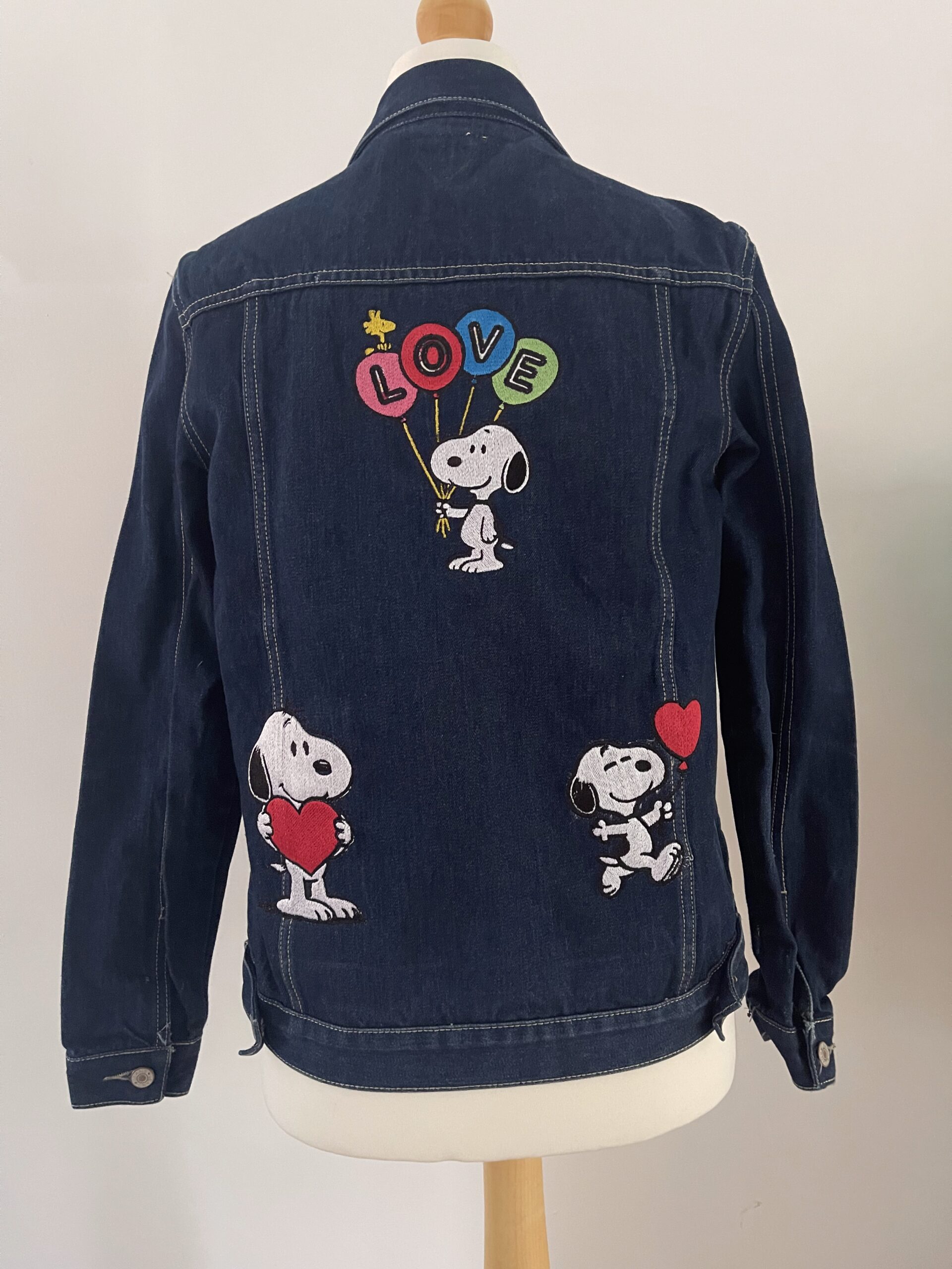 A dark blue vintage upcycled denim jacket custom embroidered with Snoopy for a fun, nostalgic look. Unisex fit, made from 100% cotton and sized M for everyday comfort. Measurements: 50cm armpit to armpit, 60cm shoulder to hem, 48cm armpit to cuff.