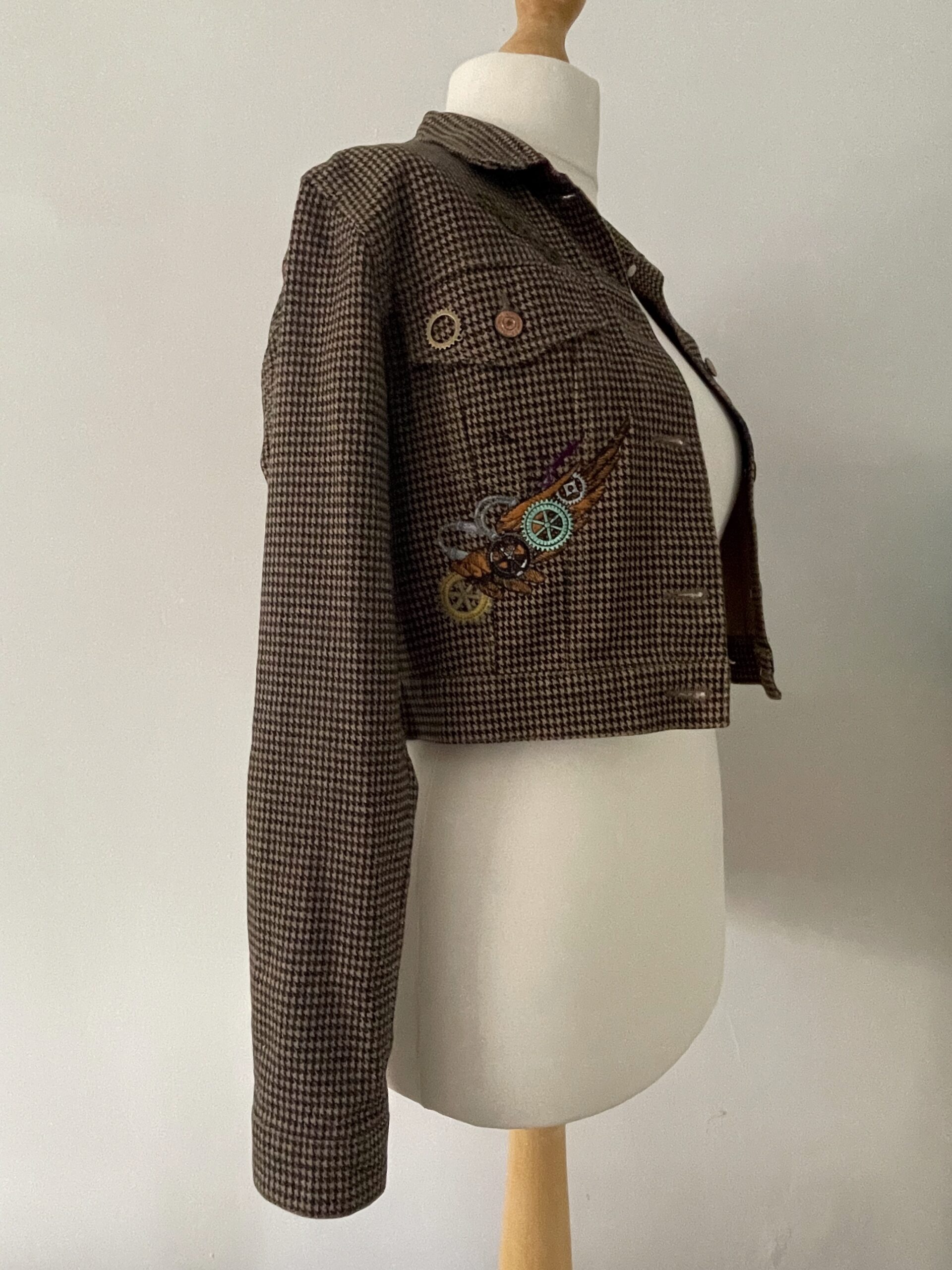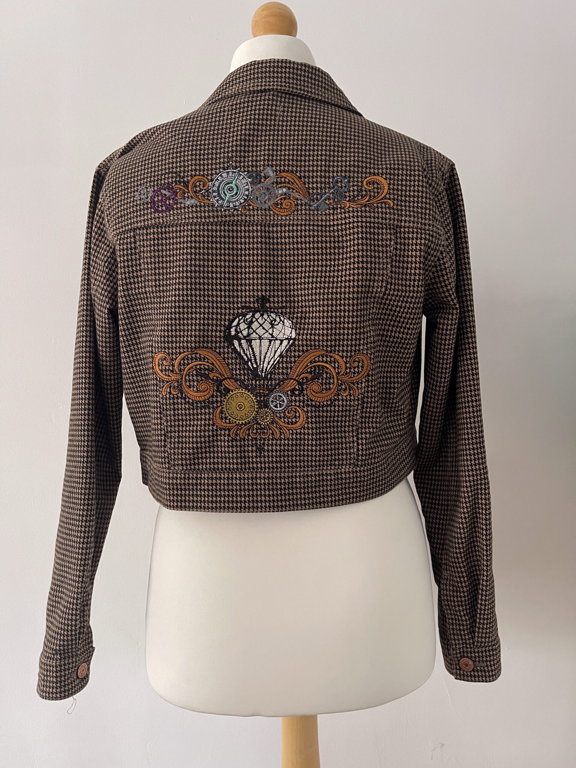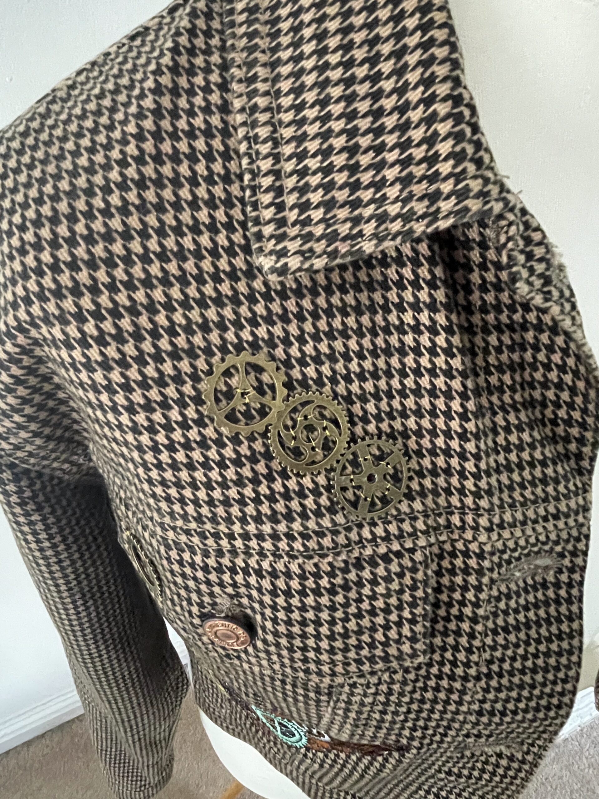A distinctive Ladies Vintage Upcycled Dog‑Tooth Denim Jacket featuring custom‑embroidered steampunk detailing with cog embellishments.