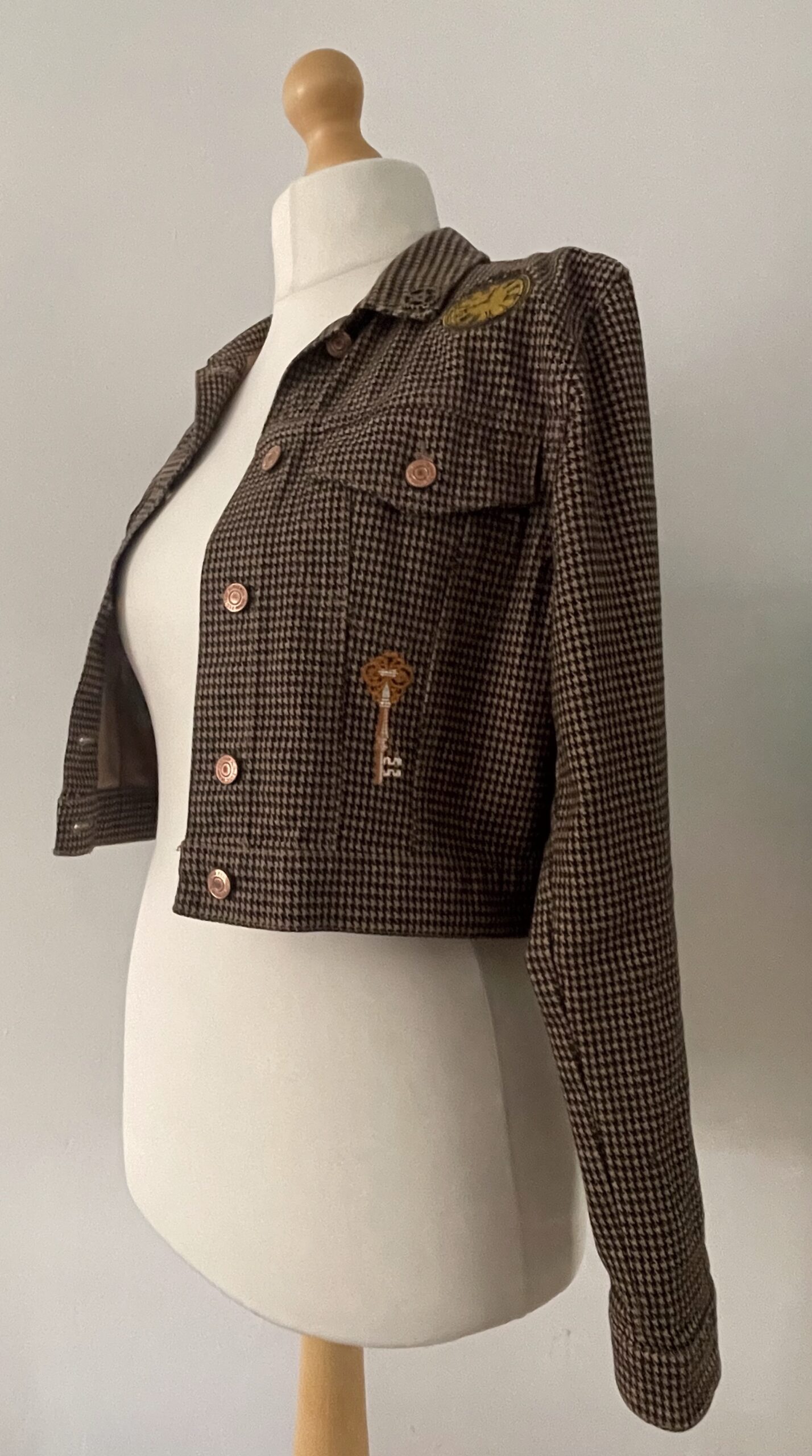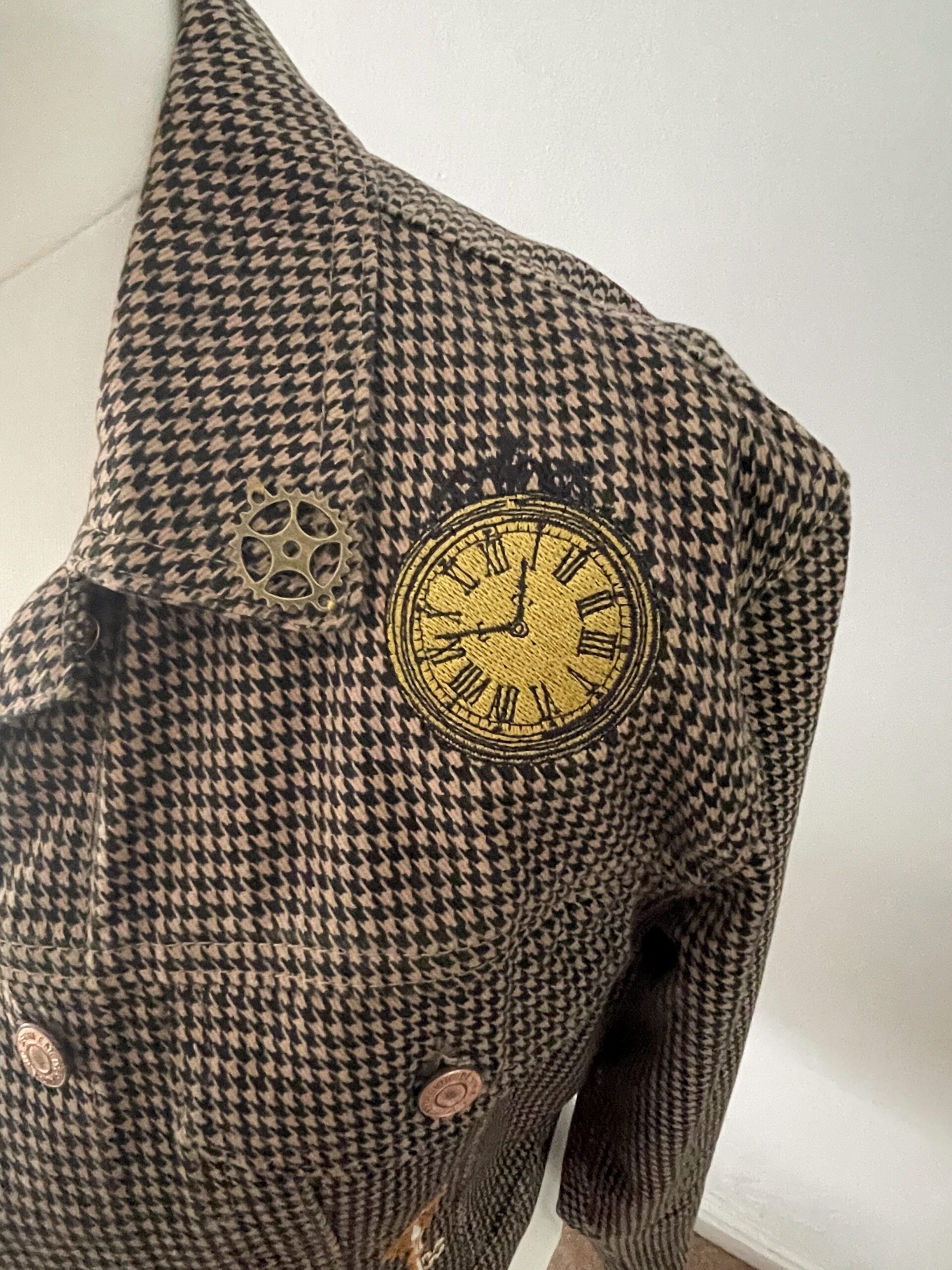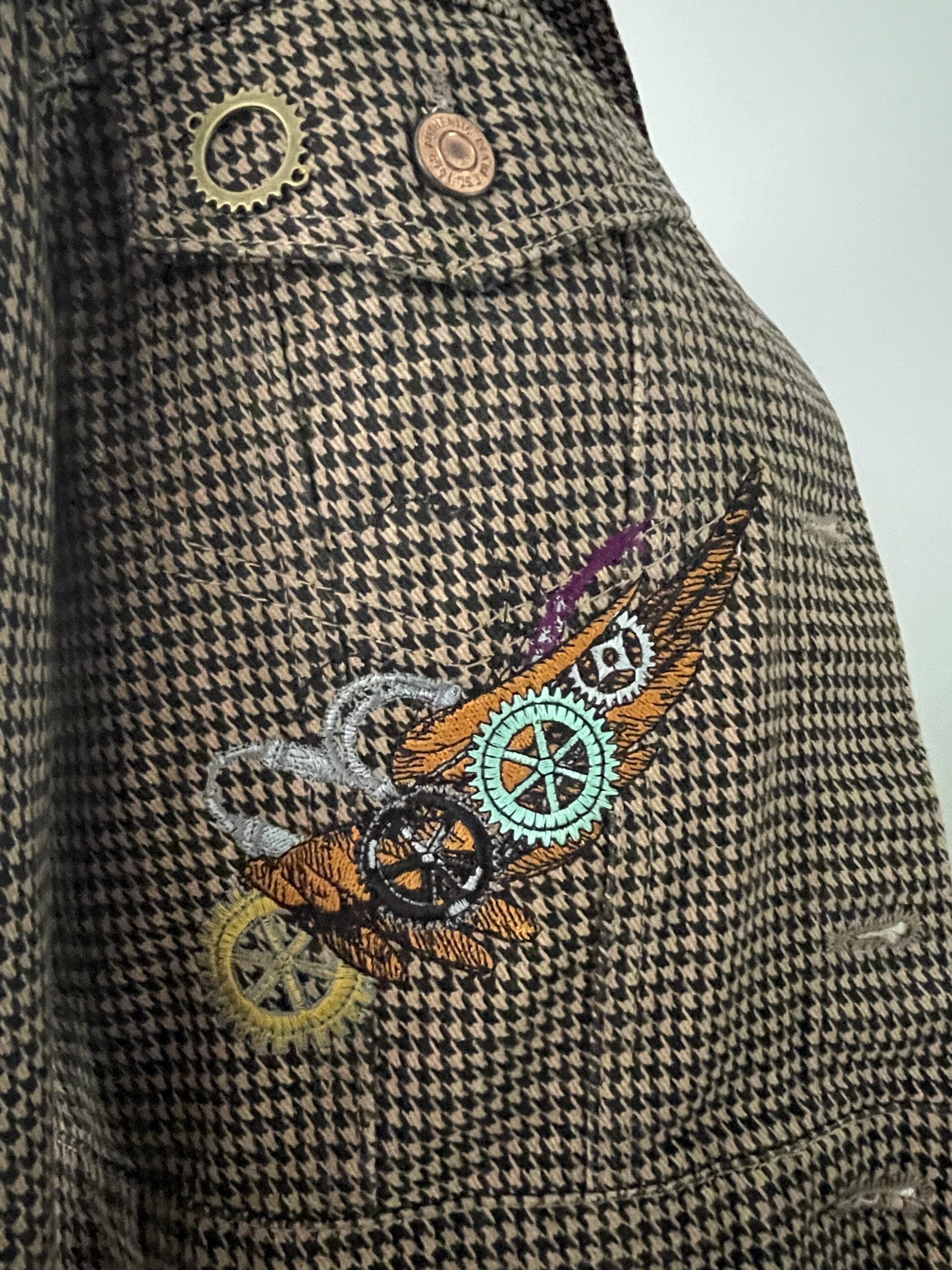 A distinctive Ladies Vintage Upcycled Dog‑Tooth Denim Jacket featuring custom‑embroidered steampunk detailing with cog embellishments.