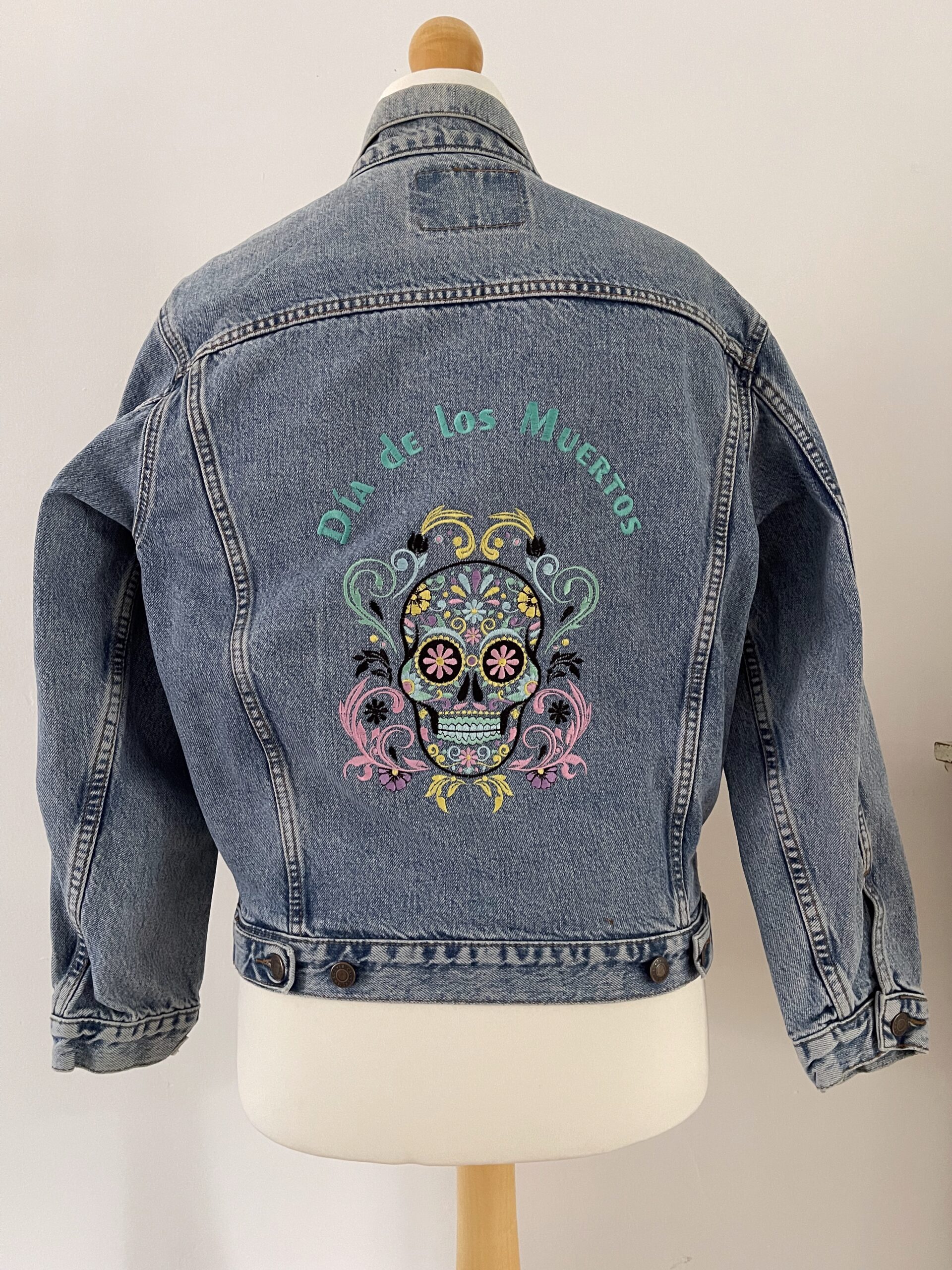 A light blue vintage upcycled G‑Star denim jacket custom embroidered with a bold Sugar Skull and Día de los Muertos design. Unisex fit, made from 100% cotton and sized S for a comfortable, unique statement piece. Measurements: 56cm armpit to armpit, 55cm shoulder to hem, 43cm armpit to cuff.