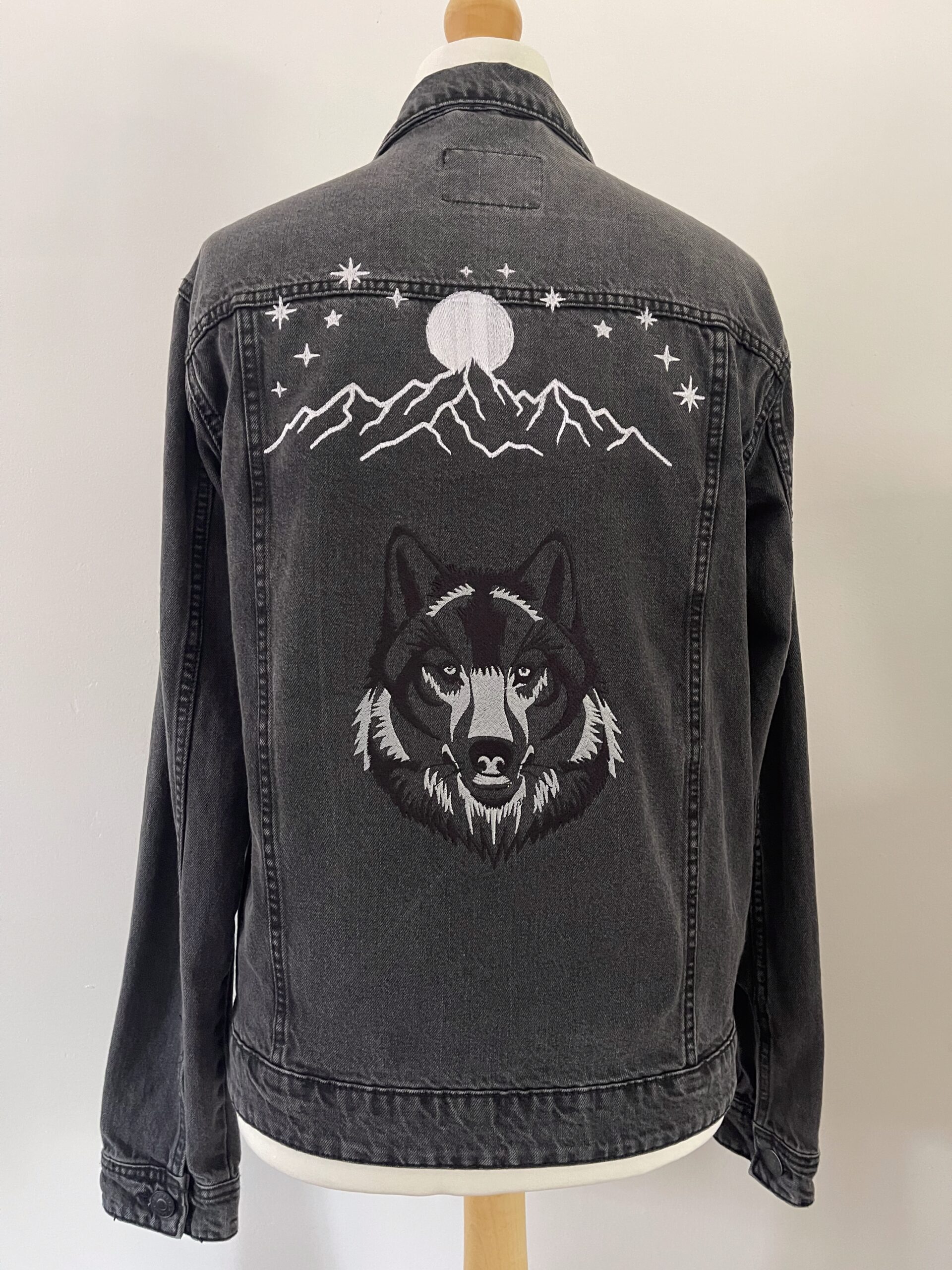A light blue vintage upcycled denim jacket custom embroidered with a striking wolf head, mountains and moon design. Unisex fit, made from 100% cotton and sized S for a comfortable, unique statement piece. Measurements: 54cm armpit to armpit, 66cm shoulder to hem, 56cm armpit to cuff.