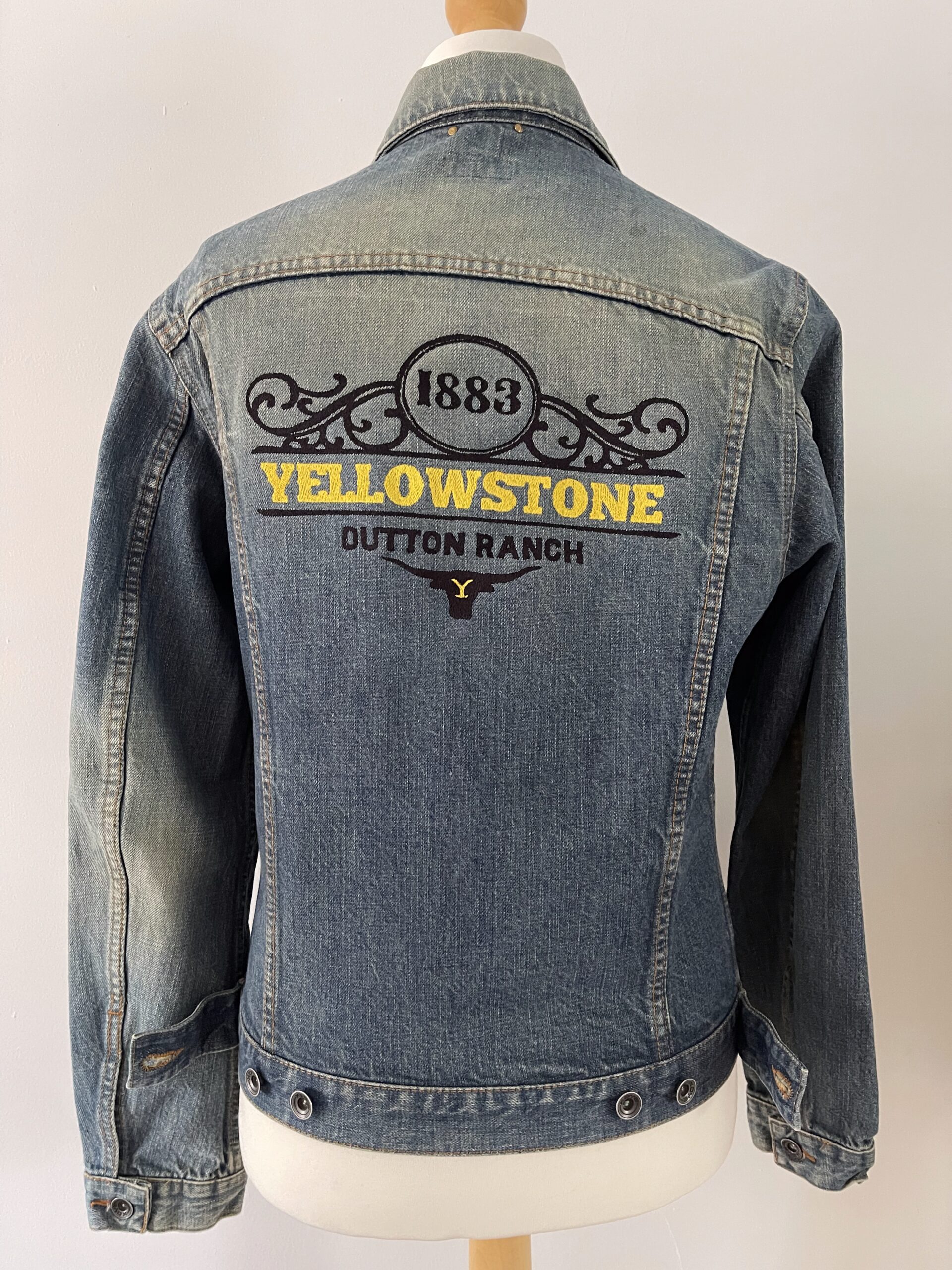 Vintage upcycled denim jacket custom embroidered for a unique unisex style.